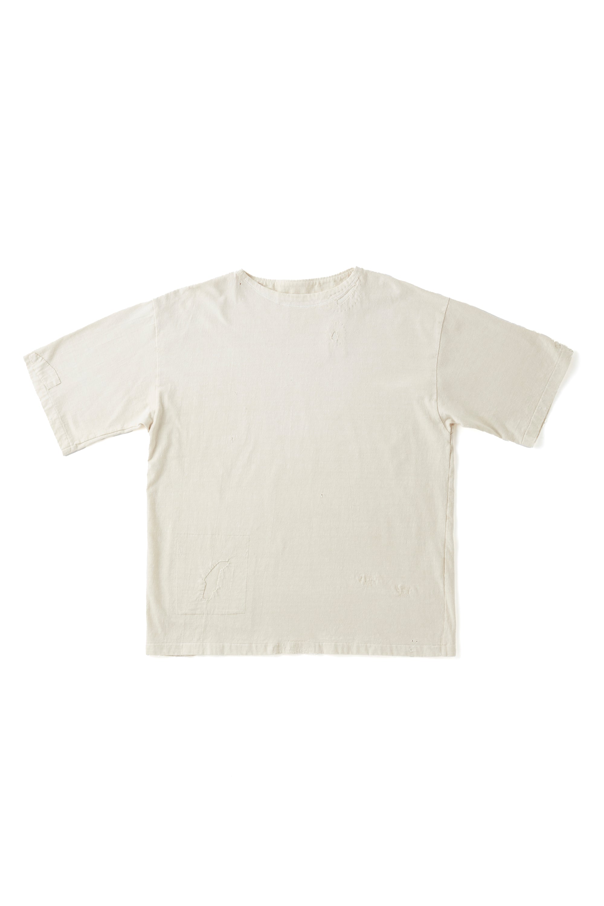 私たちのオリジナルデザインにより製作されるTシャツをベースに、それぞれにユニークなストーリーを持たせたデコレーションが他にはない存在感を放ちます。首リブを省かれ背裏がつくディテールはアーリーセンチュリー時代のスポーツウェアに散見することが出来る。またピグメントにより染められるカラーリングは深みと独特な質感が特徴的。私たちのシグネチャーピースの一つ、衣服の経年変化の様や補修跡、ダメージをデザインとして再構築させたスカーフェイスメソッドを用いて製作。大戦モデルと呼ばれる当時の形状を再現した糸を使用して制作した天竺。時代背景を踏襲し通常の紡績工程におけるエネルギー使用率や原料のロスを限りなく省いた糸となり、ロスを削減することにより繊維長の短い繊維やネップ、綿の植物片等が通常の糸よりも多く入ることで独特な肌触りの素材に仕上げている。