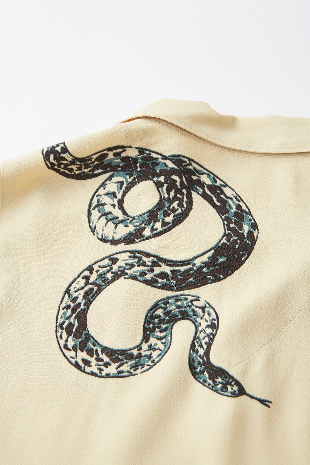 私たちの夏のシグネチャーピースの一つ、オリジナルテキスタイルのワンナップカラーシャツ。長く伸びたトップループ、バックヨークレスのディテール、アールの付いた襟先など、とてもクラシカルでいて上品な佇まいのこのシャツは1940〜50sのアーカイブピースからのインスピレーションによるもの。また毎シーズンアップデートされるテキスタイルも目を引きます。 “NUTS ART WORKS”のハンドドローイングによるユニークなタッチの蛇が他にはない存在感を醸し出す。短繊維のスフレーヨンで織り上げることで、天然繊維のような自然な光沢に抑え、さらりとした風合いと清涼感、ちりめんの凹凸が上品な表情に仕上げている。