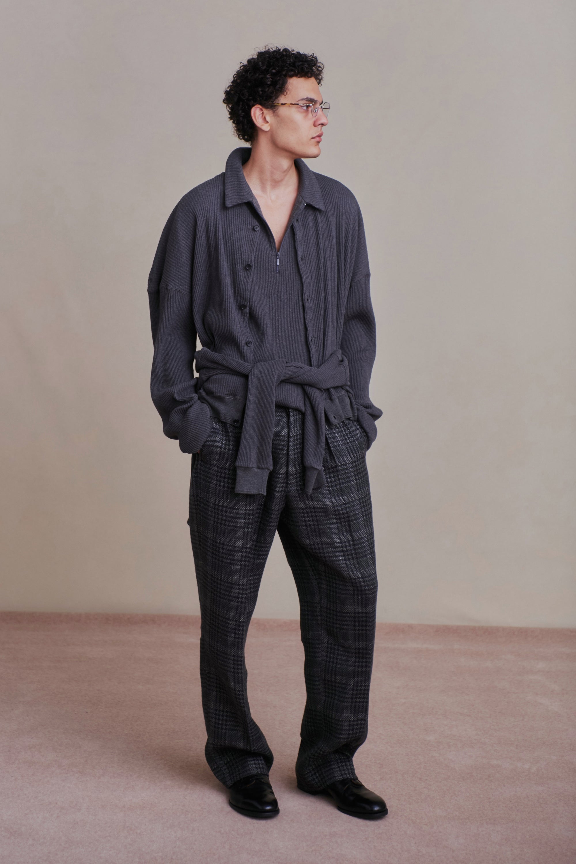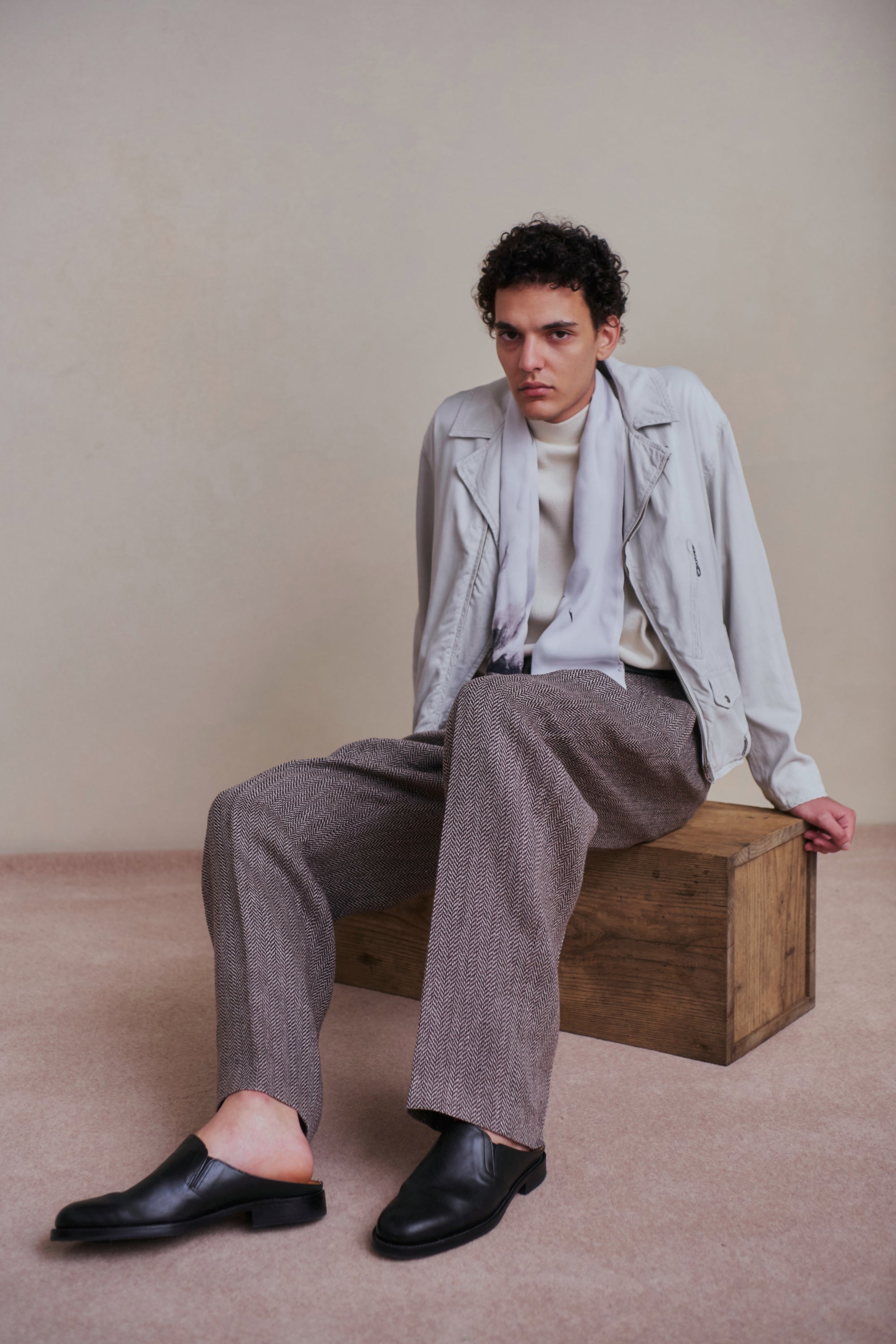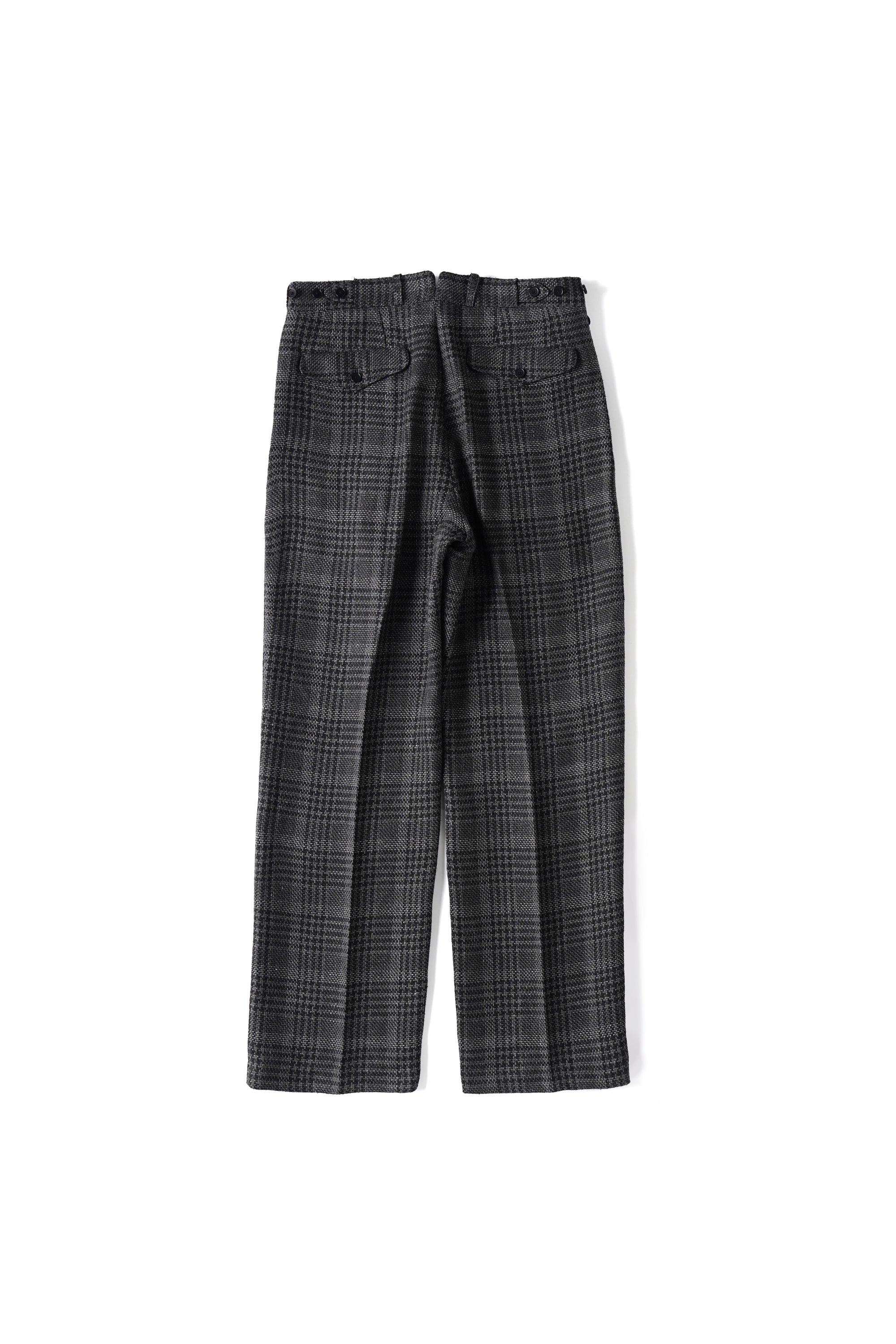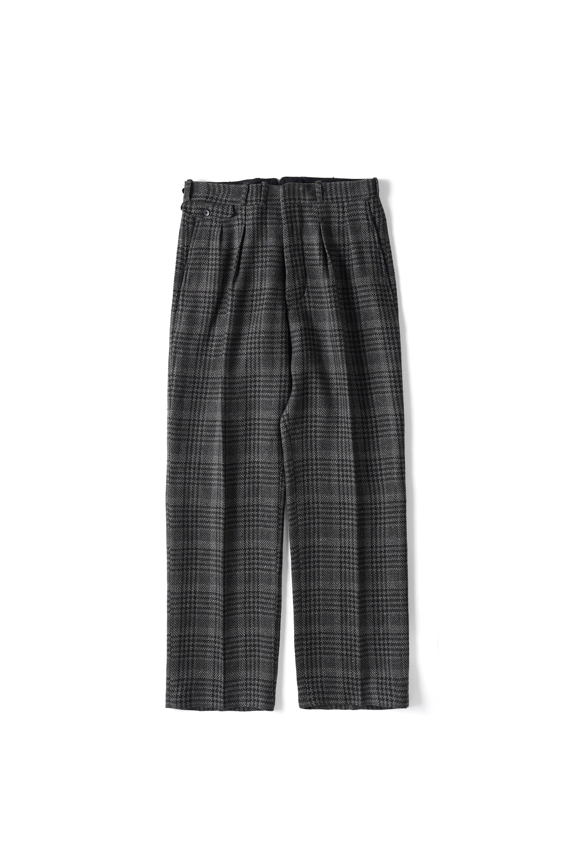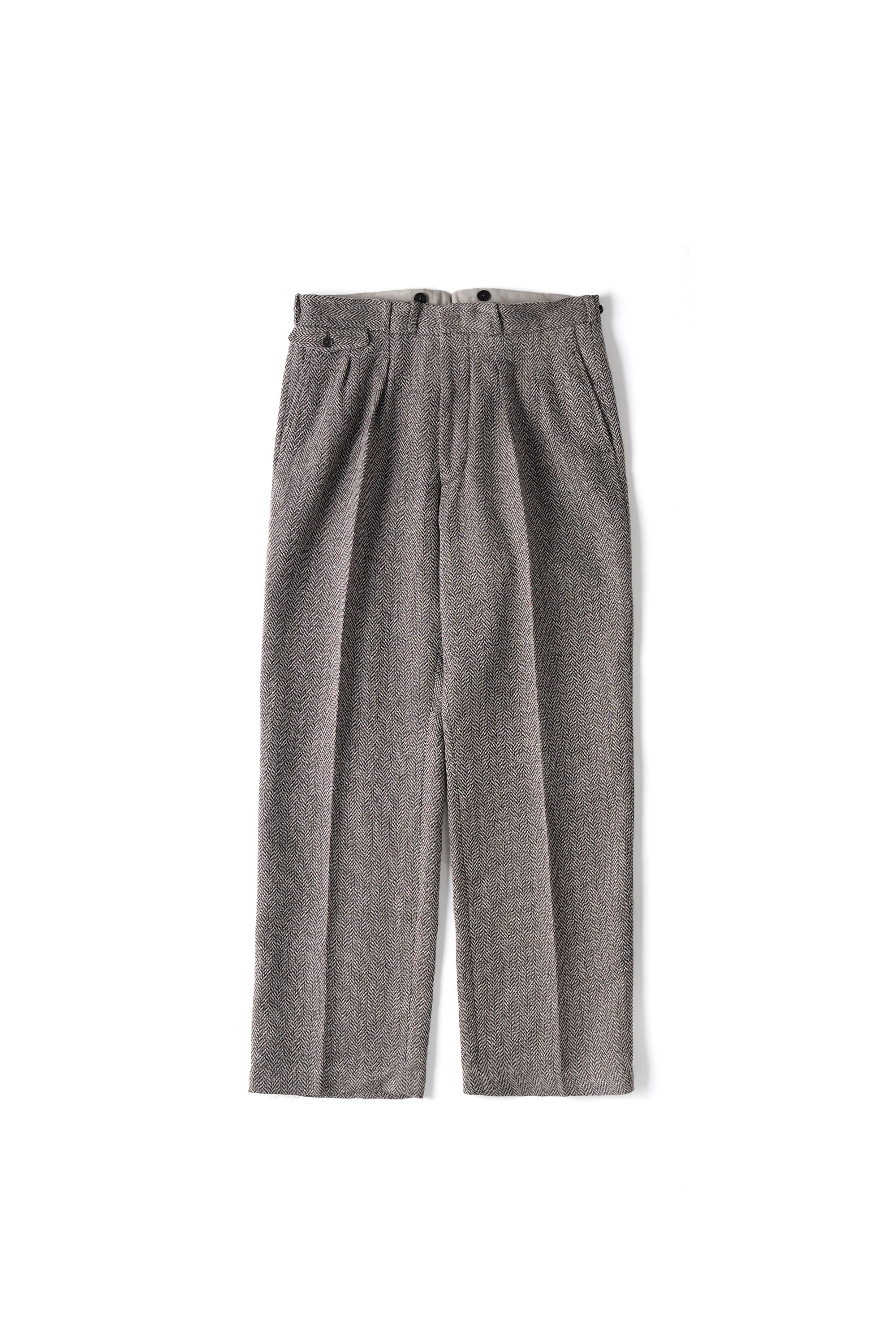 ブレザーとセットアップでの展開となるドレープトラウザー。ダブルプリーツ、ウォッチポケット、サイドアジャスターなど1920年代を彷彿させるクラシカルなディテールが目を引きます。深い股上と、ゆとりを持たせたもも周り、ワイドなわたり巾から膝から裾まで絞れる事ない綺麗なストレートラインは革靴やブーツは勿論、スニーカーなどとの相性も良くサスペンダーで吊るして履くと、ハイウエストで更に綺麗な脚のラインをキープしてくれます。< FANCY PLAID >フランス(ノルマンディー地方)の原料を使用したリネンと紬糸を交撚した別注糸を使用 。紬糸のネップ、リネンの糸節といった天然素材ゆえの不均一性が程度な意匠効果を醸し出す。リネンTOP引き揃えに紬糸を撚り合わせることで、より深い色と表情感を演出。配色の細部にまで拘ったオックス組織のグレンチェックは完全オリジナル。< FANCY HERRINGBONE >フランス(ノルマンディー地方)の原料を使用したリネンと紬糸を交撚した別注糸を使用 。紬糸のネップ、リネンの糸節といった天然素材ゆえの不均一性が程度な意匠効果を醸し出す。リネンTOP引き揃えに紬糸を撚り合わせることで、より深い色と表情感を演出。あえて組織を崩したヘリンボーンは完全オリジナル。