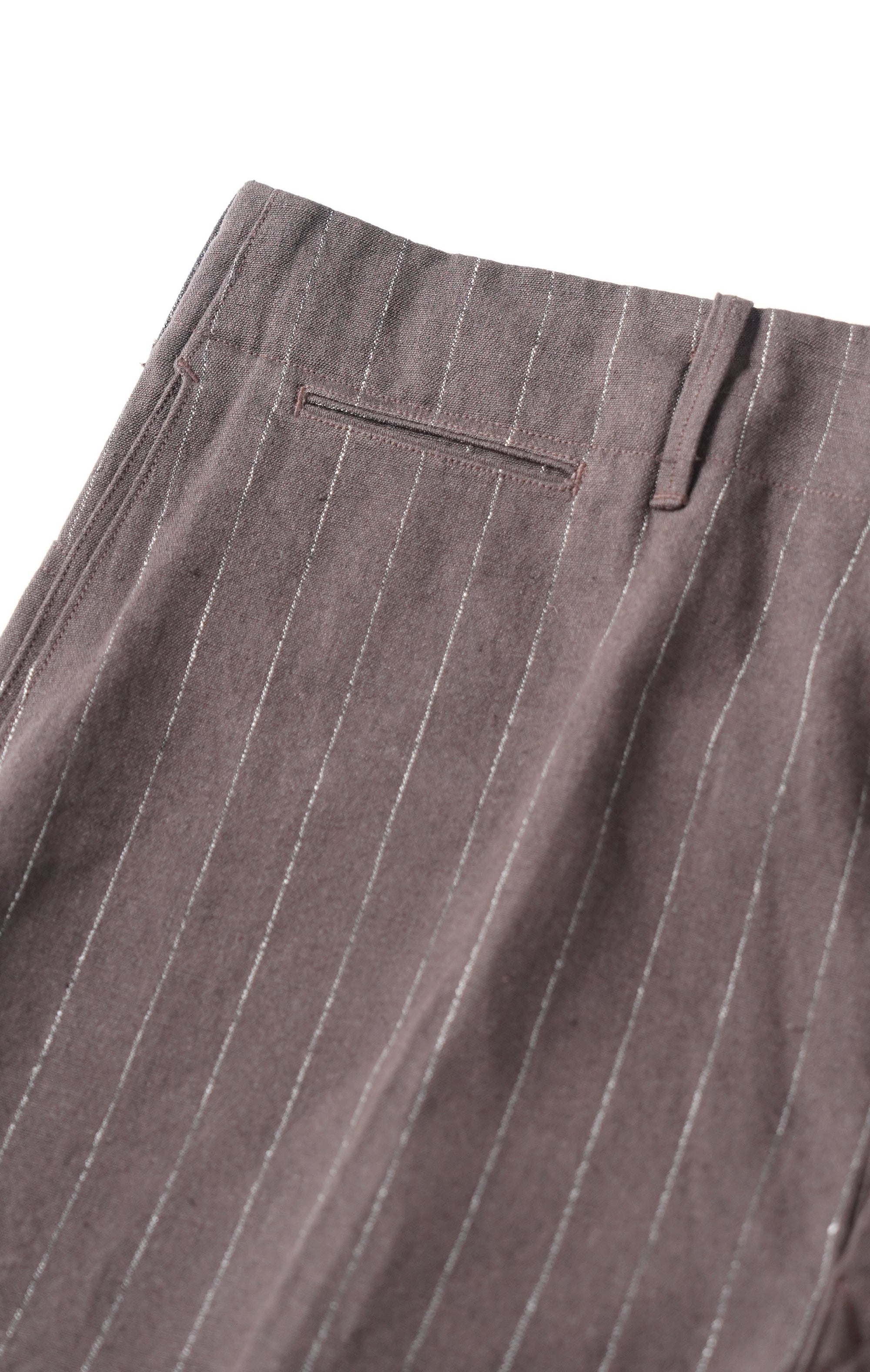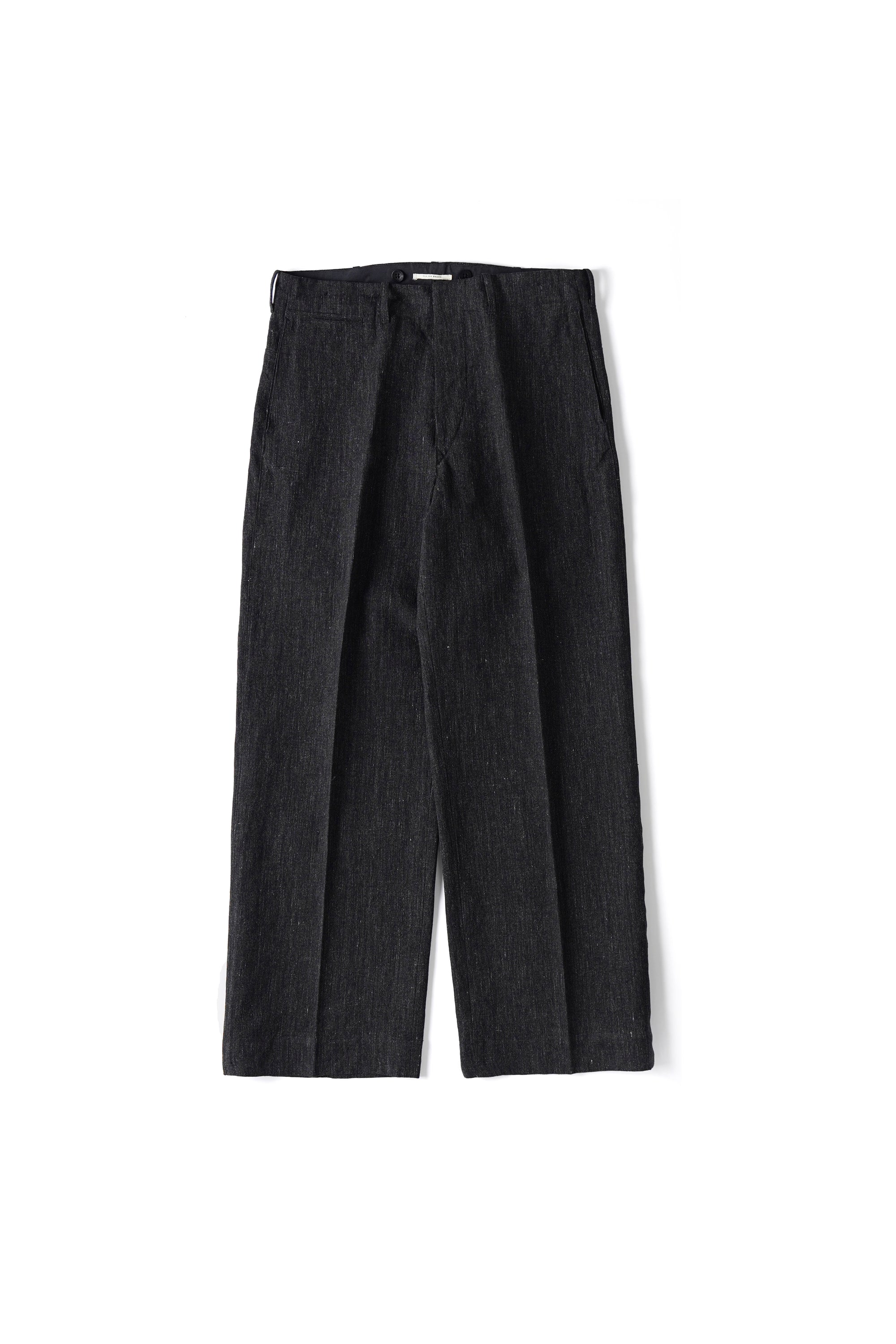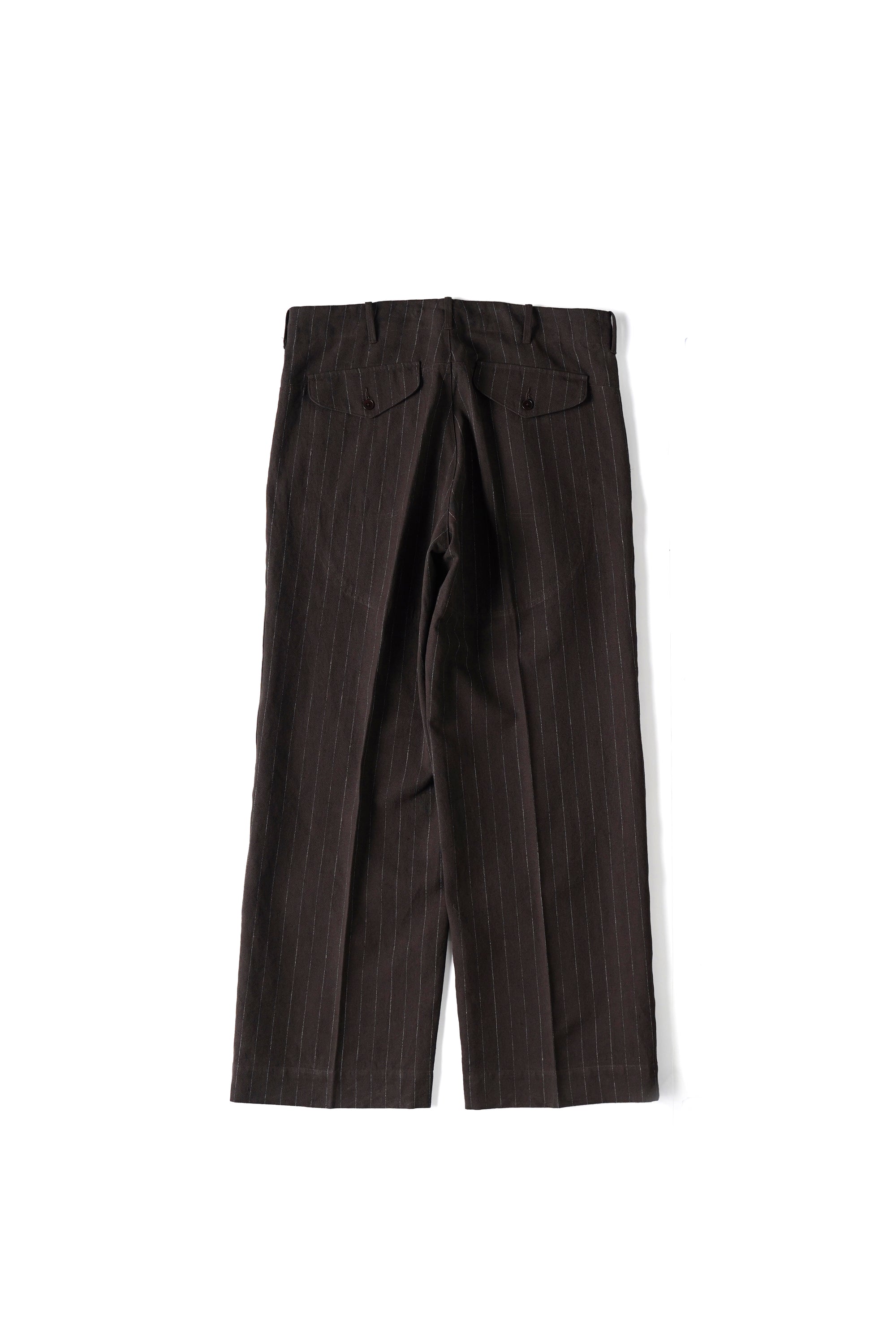 パデッドポケットがレイアウトされたバックスタイルが目を引くトラウザー。1930年代のハンティングウェアのアーカイブからのインスパイアによりデザインされています。シンプルな表情の中に古き良き意匠設計を感じ取れる。リネンTOP糸と綿麻の混紡糸を強撚して高密度で製織し、強撚による硬さと、生地規格による詰まり感が独特の風合いを感じることができる。経緯に濃淡の糸を1:1で製織しているため、微かにヘアラインに見えるのも特徴。