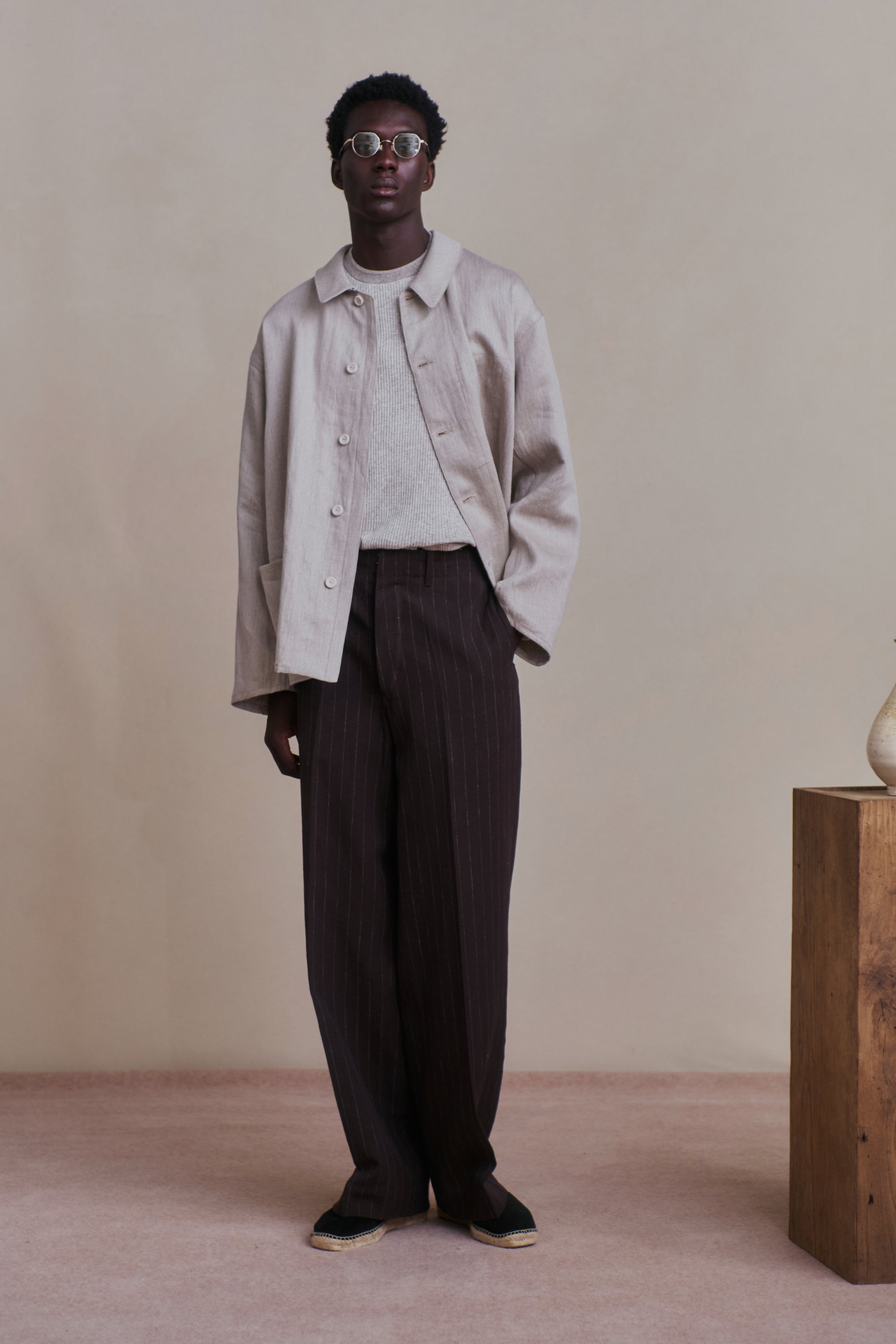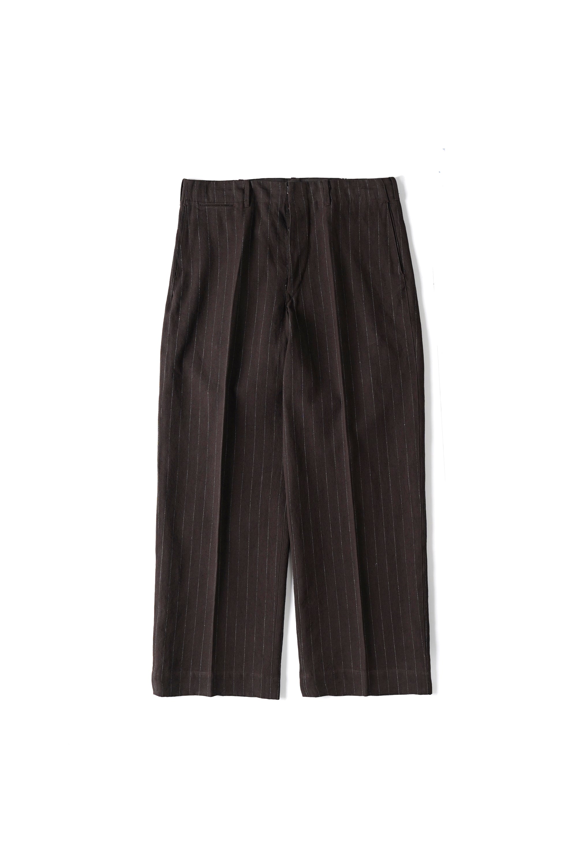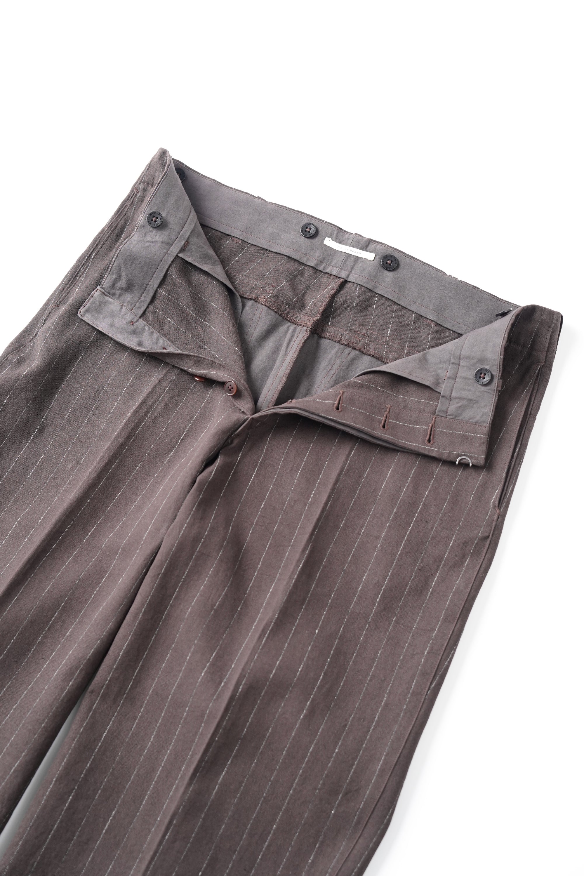 パデッドポケットがレイアウトされたバックスタイルが目を引くトラウザー。1930年代のハンティングウェアのアーカイブからのインスパイアによりデザインされています。シンプルな表情の中に古き良き意匠設計を感じ取れる。リネンTOP糸と綿麻の混紡糸を強撚して高密度で製織し、強撚による硬さと、生地規格による詰まり感が独特の風合いを感じることができる。経緯に濃淡の糸を1:1で製織しているため、微かにヘアラインに見えるのも特徴。