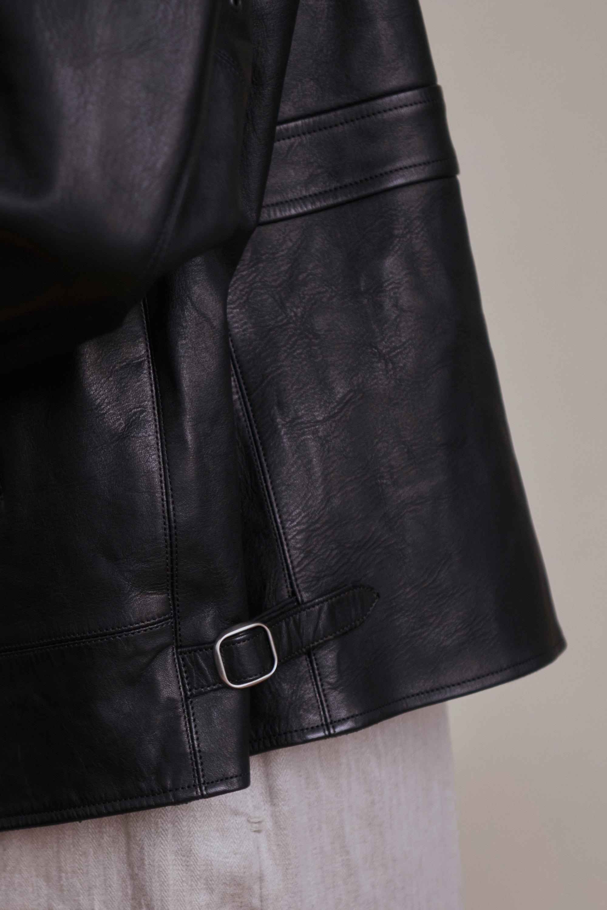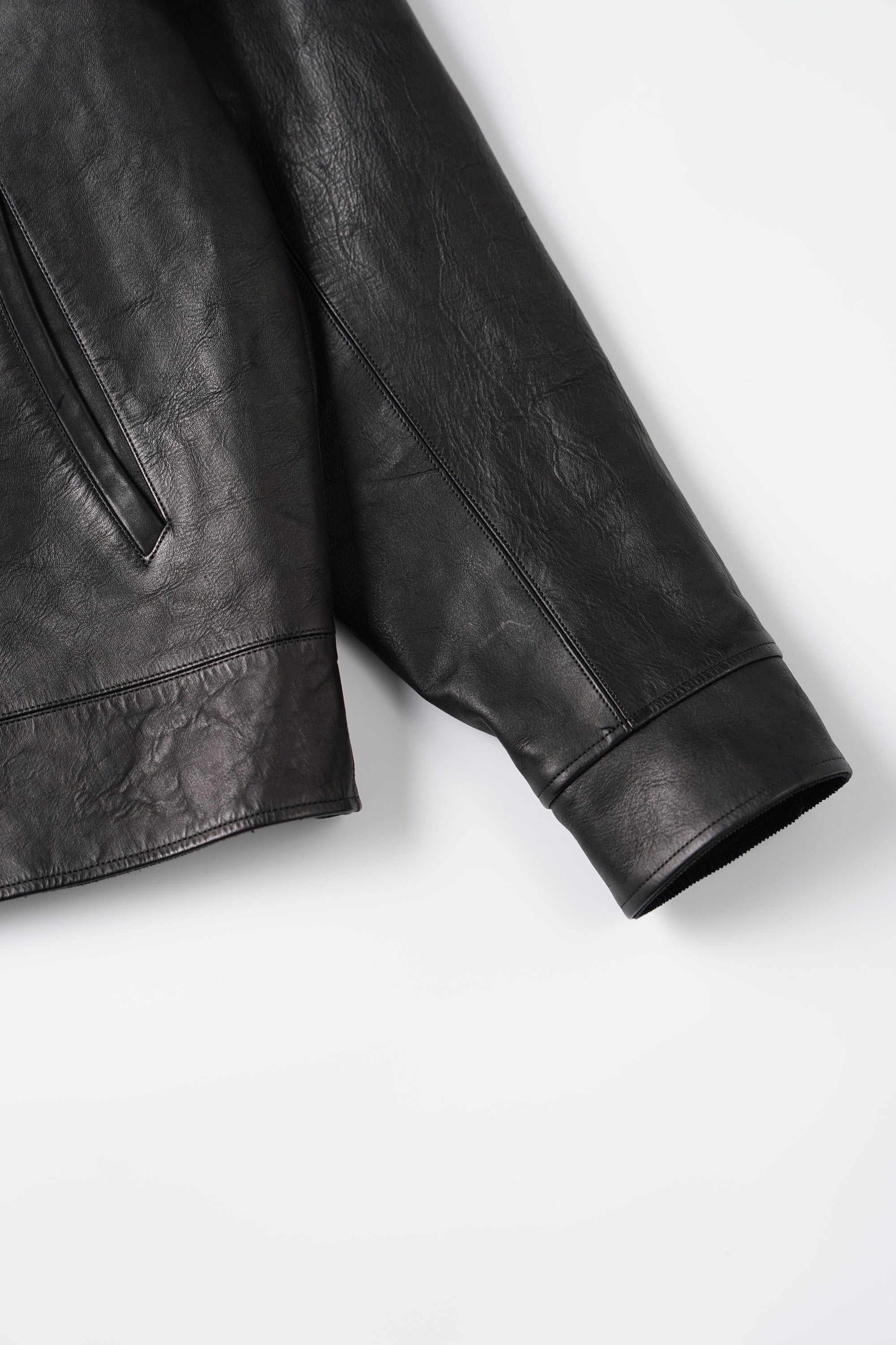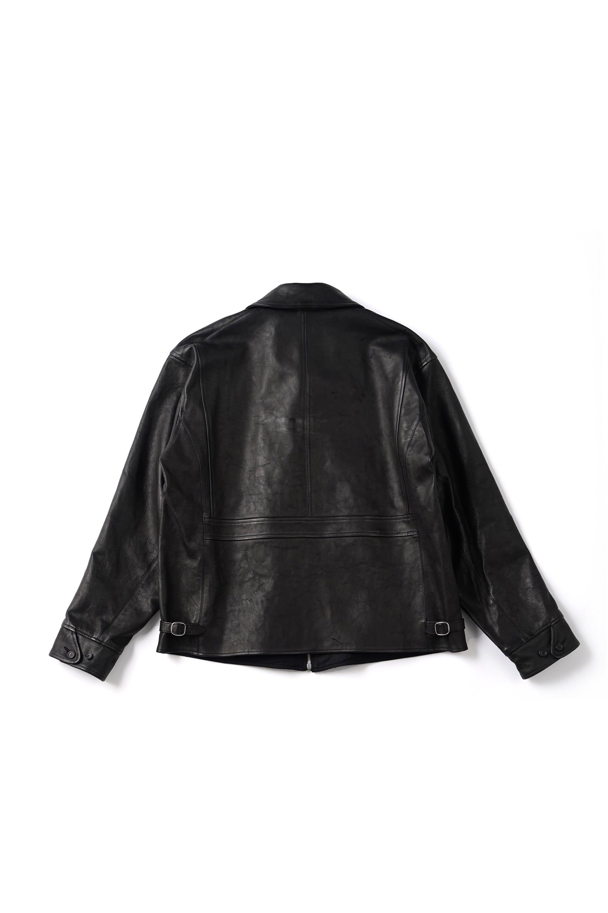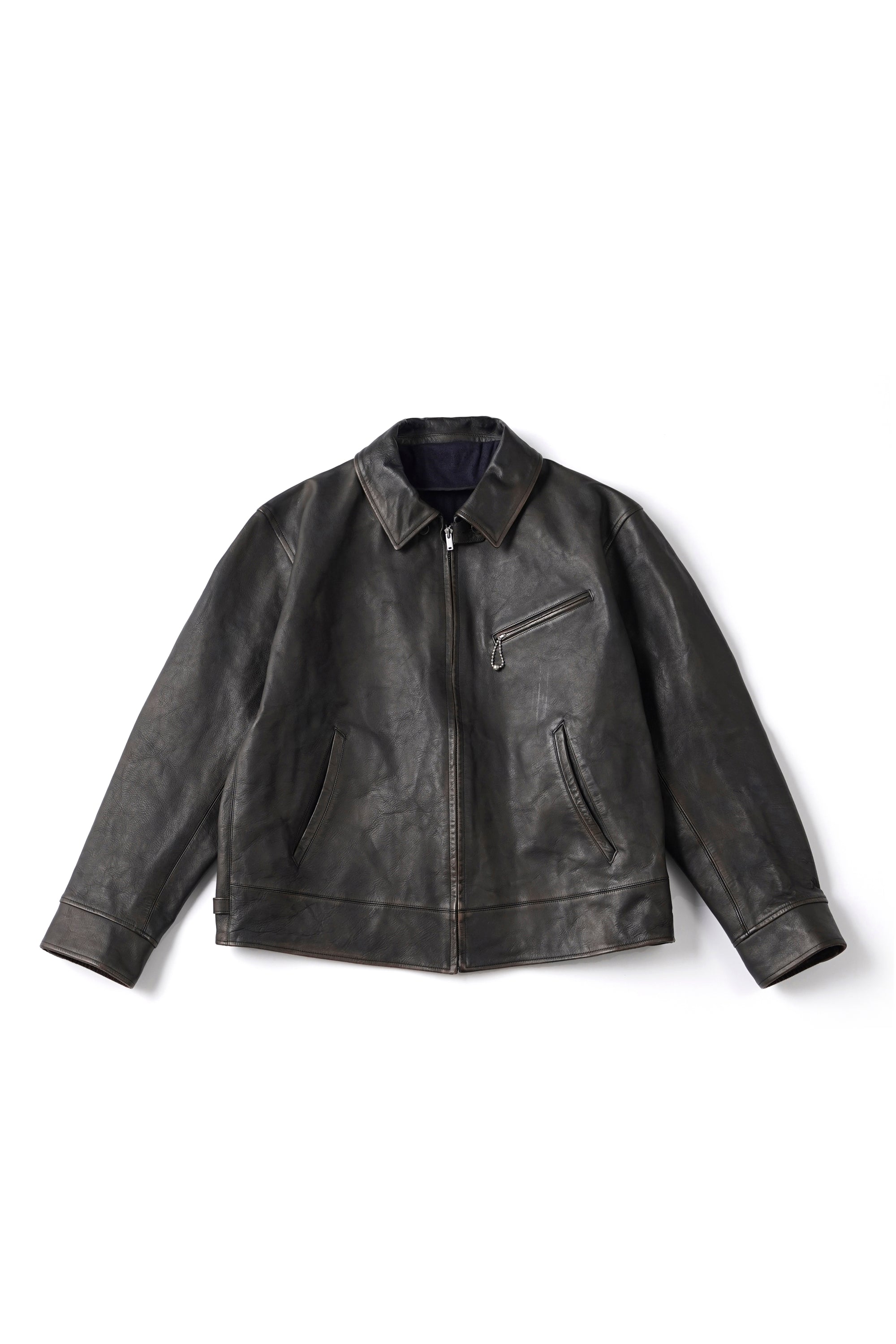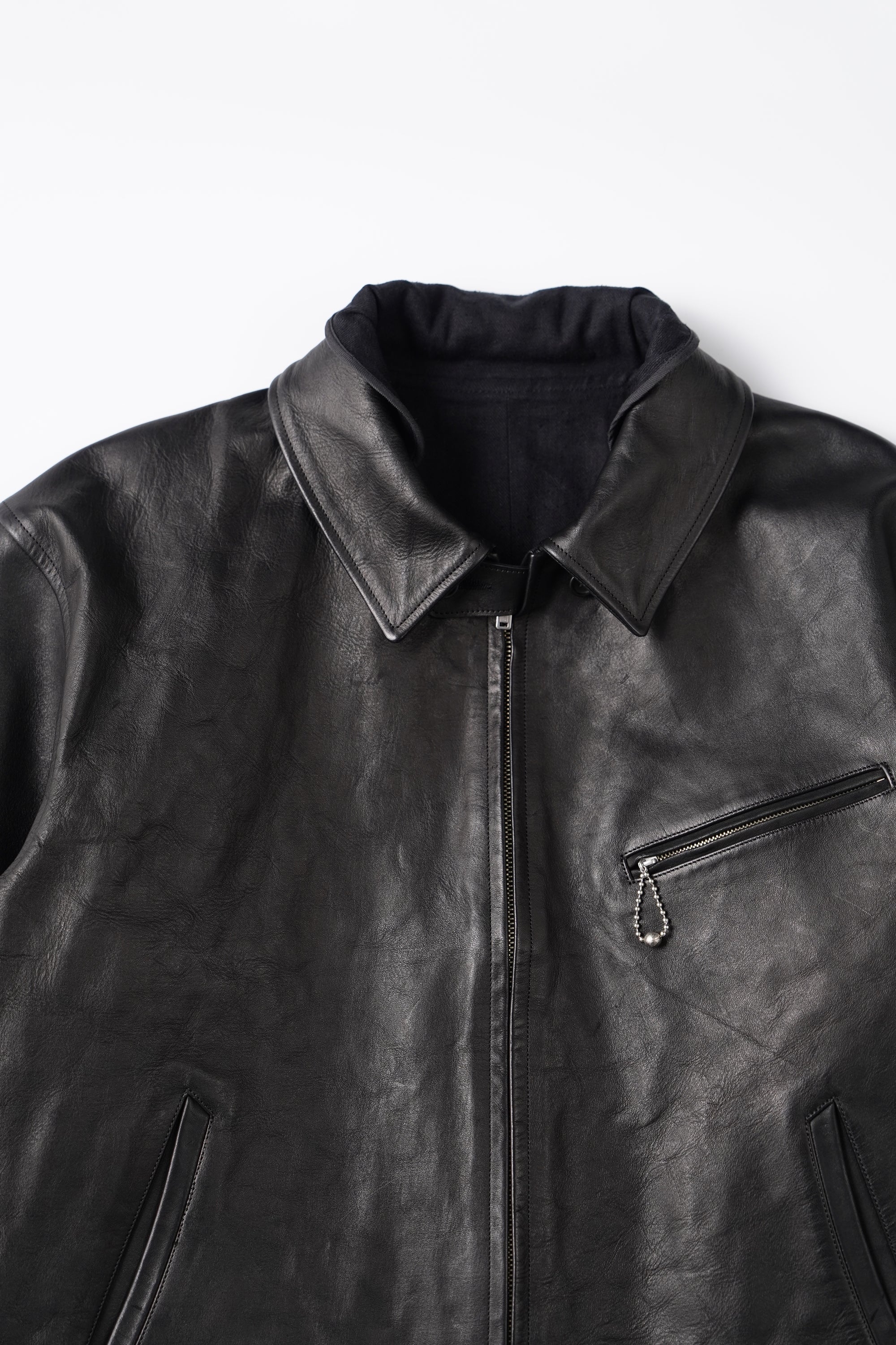 レザーアーカイブの黎明期でもある1920〜30年代のプロダクトの中でも、特に名物として知られるスポーツジャケット、チンタブにネックフラップ、オリジナルで型起こししたハンマーフィニッシュのボールチェーンスライダー、あえてユーロな佇まいを見せる襟回しのシルエットなど、シンプルな中に乙な意匠が詰まったトップクオリティピース。またオリジナルのレシピで施した味だし加工により、長年大事にされてきたかのような味わい深さが表現されています。細かなステッチに細部の仕舞いなど、国内屈指の職人による縫製テクニックも目を引きます。ざらつきのある手触りと色むらのある色調の、ラフでワイルドな仕上げが特徴のホースレザー。ソフトホース系よりも凹凸感をあえて残しており、色合いや質感が一着ずつ異なる一点物となります。裏地は経糸に1/40リネン糸を使用し、緯糸にはシルクネップ糸を贅沢に使用したMADE IN JAPANの生地を採用。洗練されたヴィンテージ感とモダンなエッセンスが融合した、着古したような風合いを体現しています。緯糸にシルクネップ糸を使用することで、自然なスラブ感と柔らかく軽やかな手触りを実現。