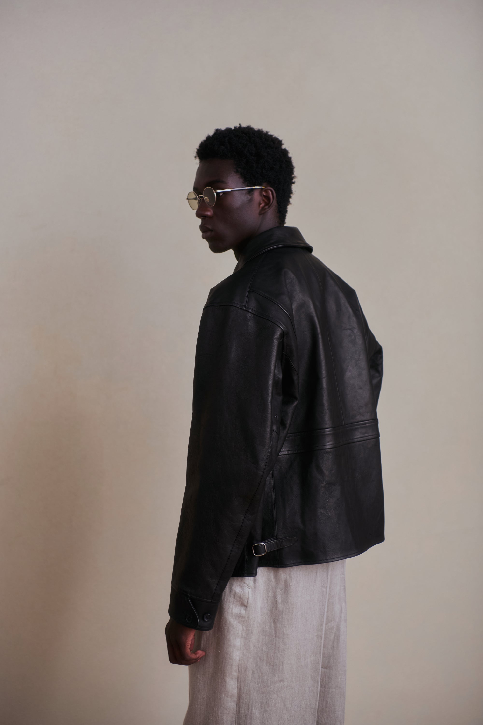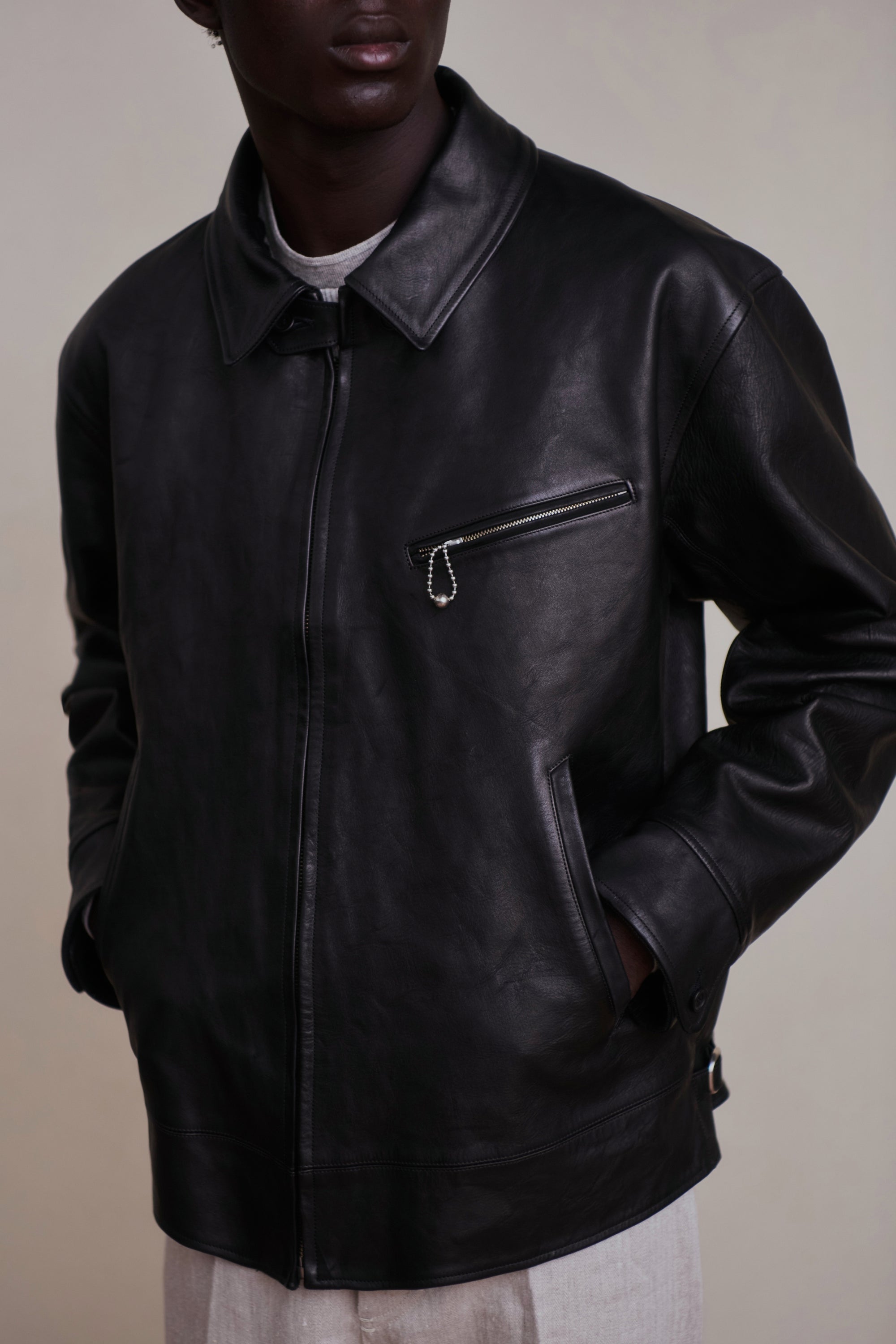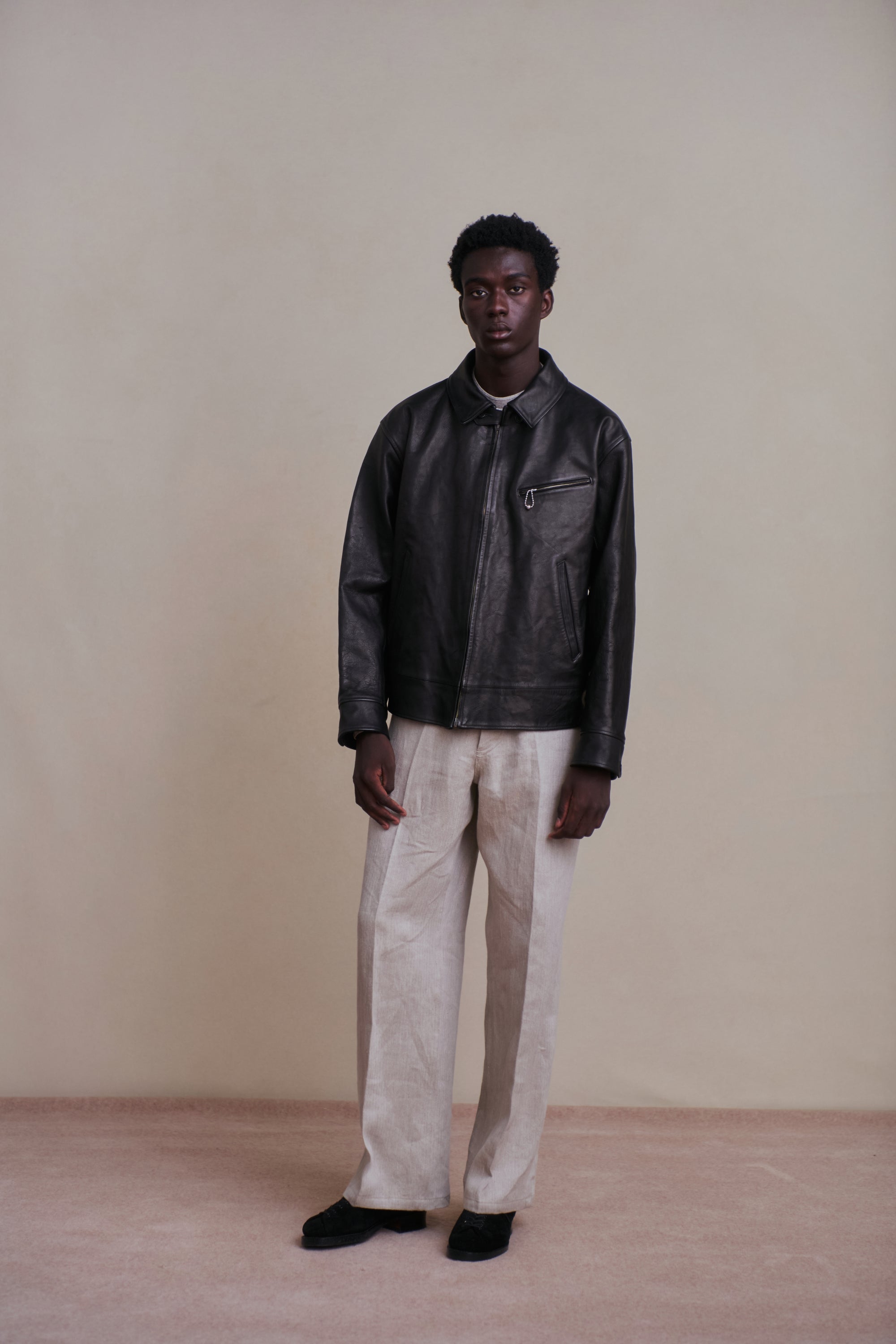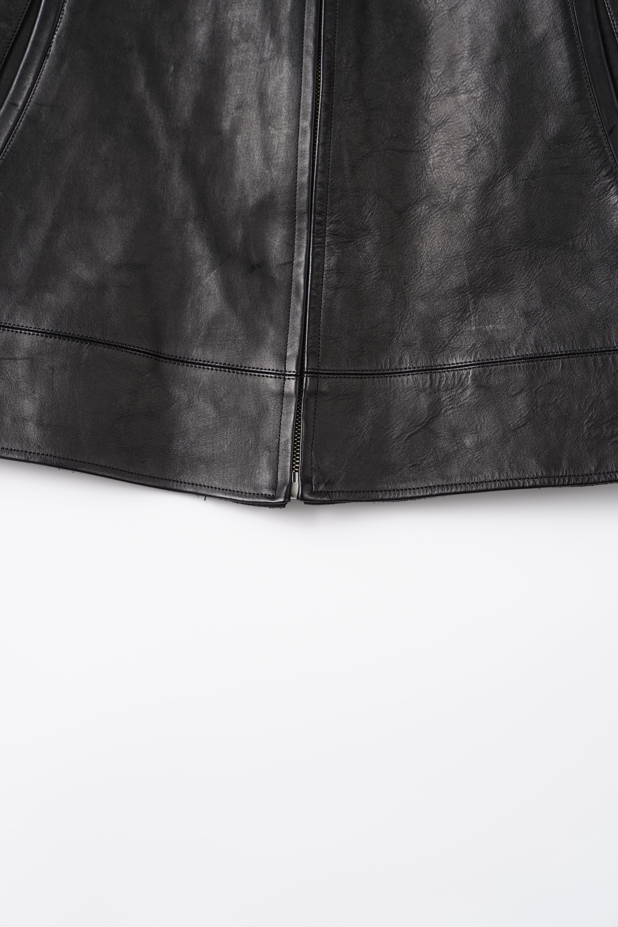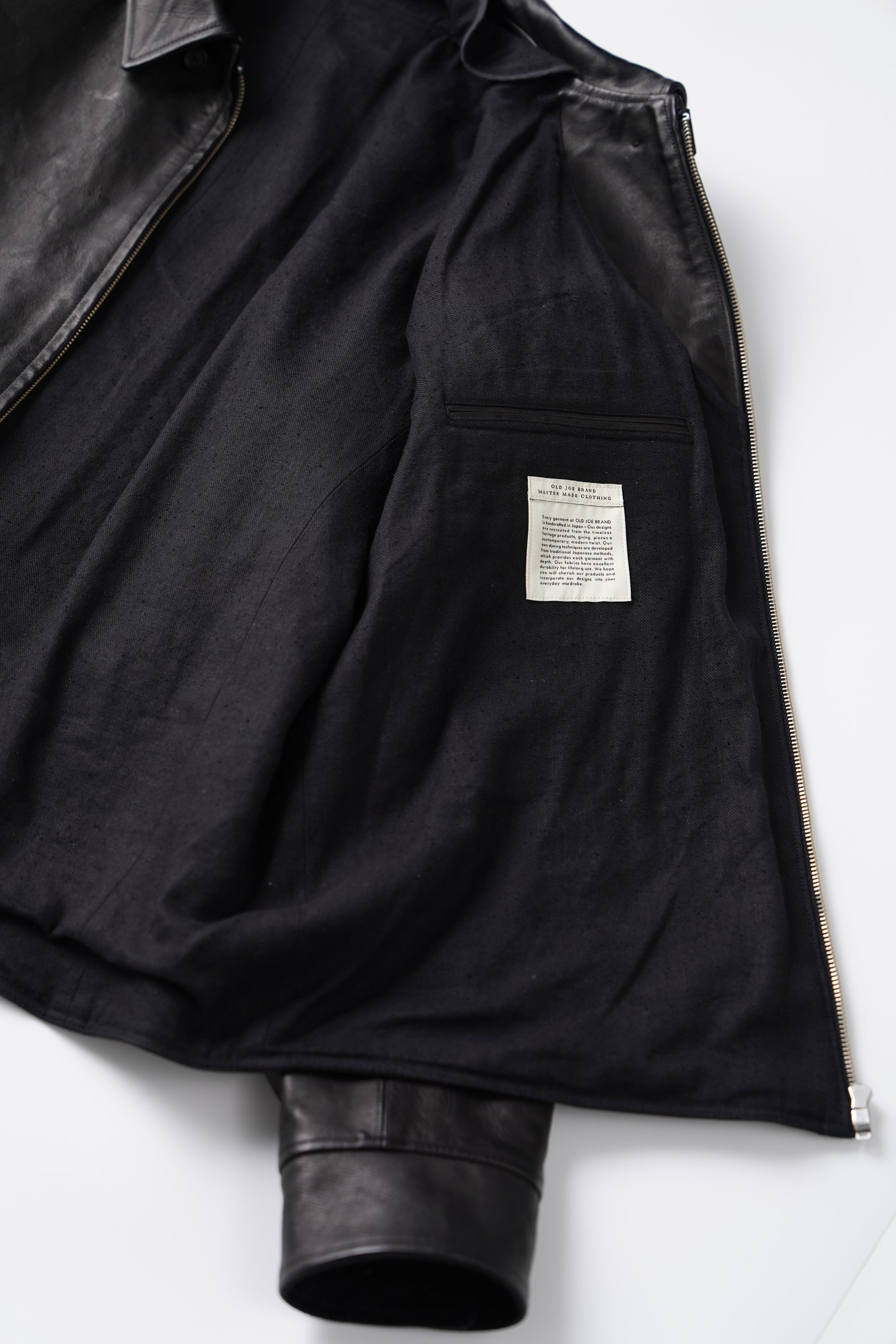レザーアーカイブの黎明期でもある1920〜30年代のプロダクトの中でも、特に名物として知られるスポーツジャケット、チンタブにネックフラップ、オリジナルで型起こししたハンマーフィニッシュのボールチェーンスライダー、あえてユーロな佇まいを見せる襟回しのシルエットなど、シンプルな中に乙な意匠が詰まったトップクオリティピース。またオリジナルのレシピで施した味だし加工により、長年大事にされてきたかのような味わい深さが表現されています。細かなステッチに細部の仕舞いなど、国内屈指の職人による縫製テクニックも目を引きます。ざらつきのある手触りと色むらのある色調の、ラフでワイルドな仕上げが特徴のホースレザー。ソフトホース系よりも凹凸感をあえて残しており、色合いや質感が一着ずつ異なる一点物となります。裏地は経糸に1/40リネン糸を使用し、緯糸にはシルクネップ糸を贅沢に使用したMADE IN JAPANの生地を採用。洗練されたヴィンテージ感とモダンなエッセンスが融合した、着古したような風合いを体現しています。緯糸にシルクネップ糸を使用することで、自然なスラブ感と柔らかく軽やかな手触りを実現。