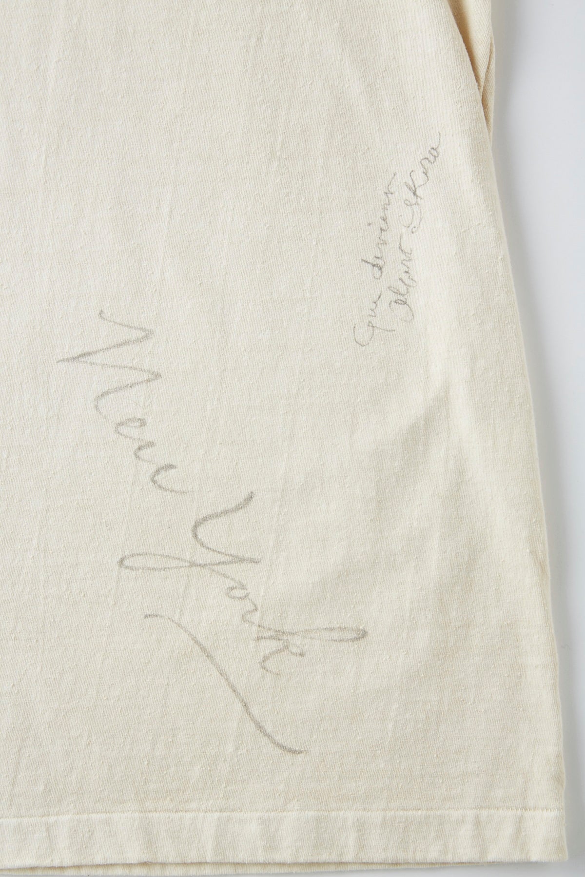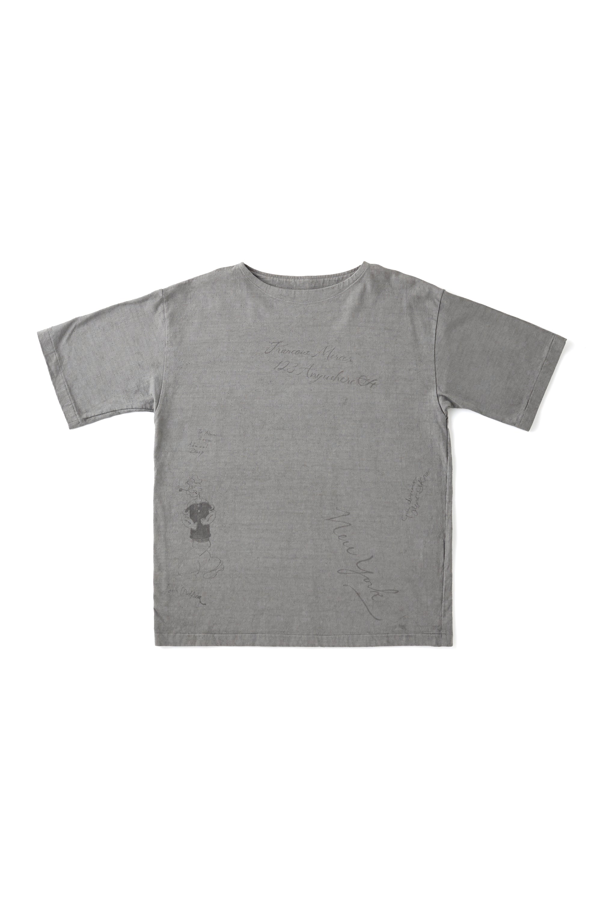 私たちのオリジナルデザインにより製作されるTシャツをベースに、それぞれにユニークなストーリーを持たせたデコレーションが他にはない存在感を放ちます。首リブを省かれ背裏がつくディテールはアーリーセンチュリー時代のスポーツウェアに散見することが出来る。硫化染料により生み出される淡い独特なトーンが特徴的。そしてアーカイブピースでも見られるような持ち主の素描が全面に入っており、見るだけでも楽しいピースに仕上がった。大戦モデルと呼ばれる当時の形状を再現した糸を使用して制作した天竺。時代背景を踏襲し通常の紡績工程におけるエネルギー使用率や原料のロスを限りなく省いた糸となり、ロスを削減することにより繊維長の短い繊維やネップ、綿の植物片等が通常の糸よりも多く入ることで独特な肌触りの素材に仕上げている。