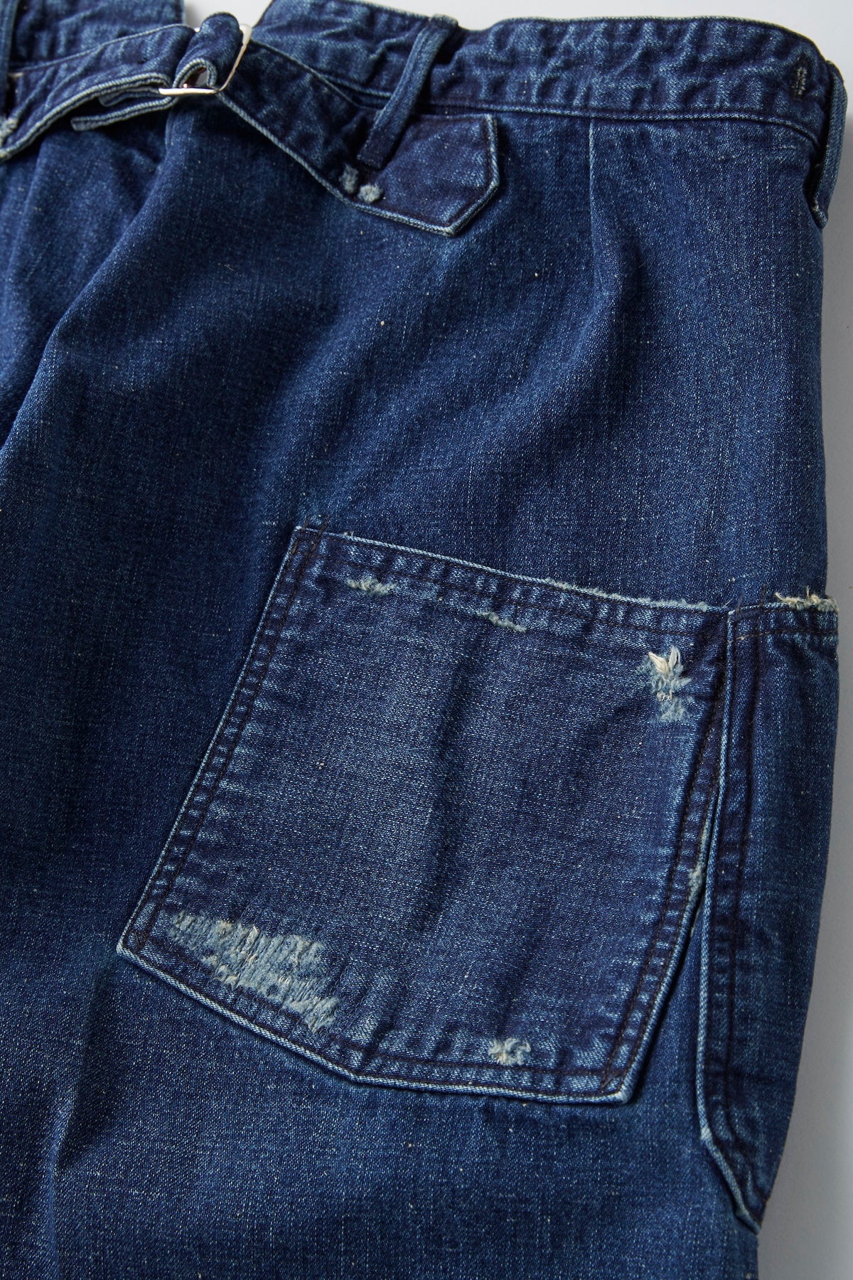 セーラーユニフォームに倣いシームレスになったサイドビューに、然るべき位置に配した機能性の高いパッチポケット、無駄なディテールを削ぎ落としたシンプル且つヘリテージな佇まいがモダンに写る。9.6oz OLDJOE original denim糸に拘り、オリジナルのデシネップを使用しています、タテ糸は、デニム本来の素朴さやドライ感、バルキー感を表現するために繊維長の短めの綿も混ぜ込んで糸をつくりました。ヨコ糸は、米綿をメインにオーストラリア、ブラジル綿とブレンドし、安定した質感を目指し、また追燃することにより柔らかさの中にシャリ感をだしています。ロープ染色は黒味の強いインディゴ染料で染色し、深い色目を表現しています。生地はいわゆるキバタと言われる織り上がった状態のものから、特殊な方法でサンフォライズ(防縮加工)のみをかけています。キバタの風合いを損なわず、表面の毛羽感も残しました。風合いや色味の重厚感、実際手に取った時の軽さや、着用時の履きやすさ、糸使いも含めて、OLDJOEオリジナルデニム。