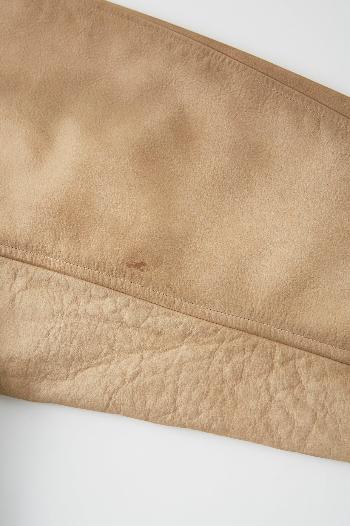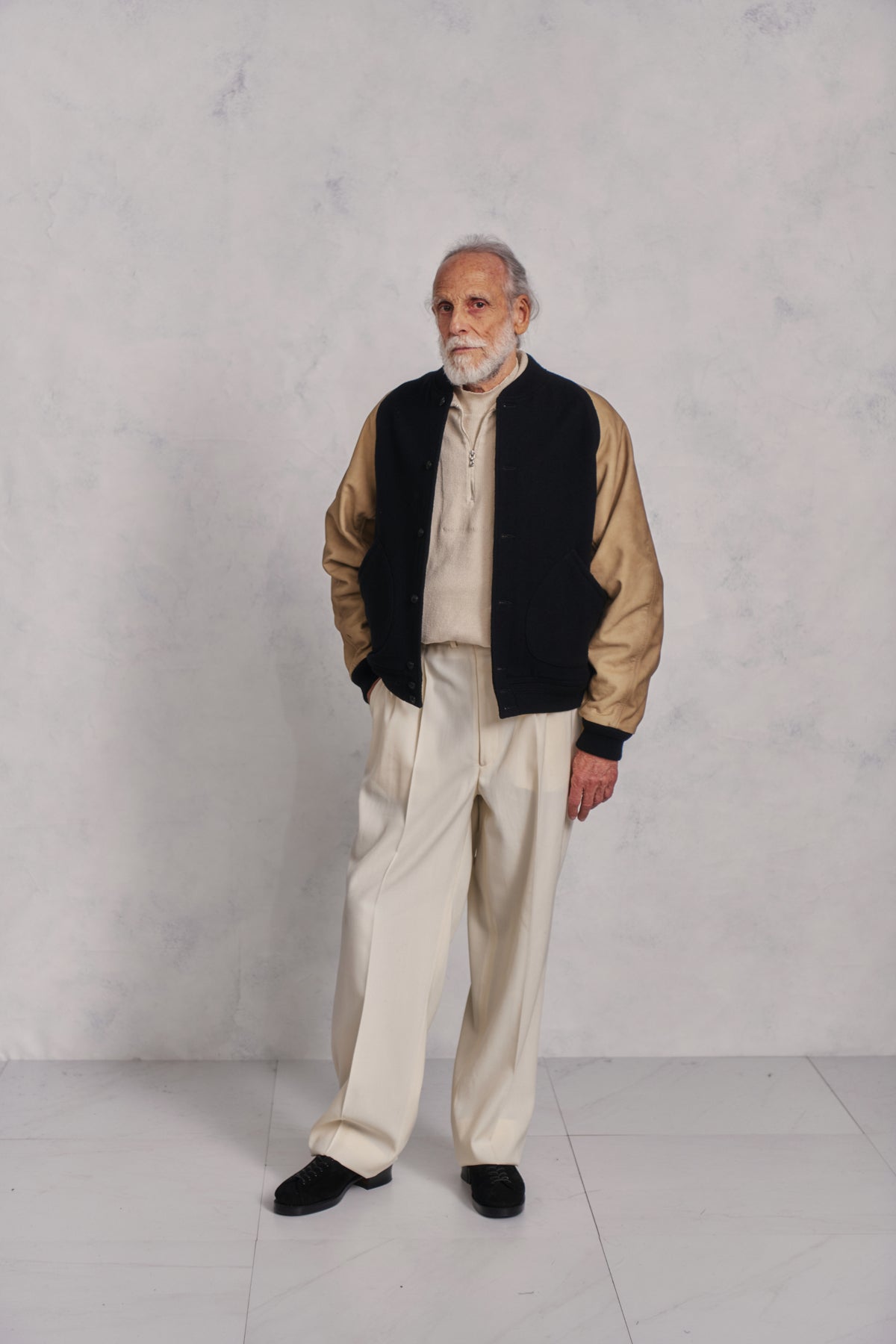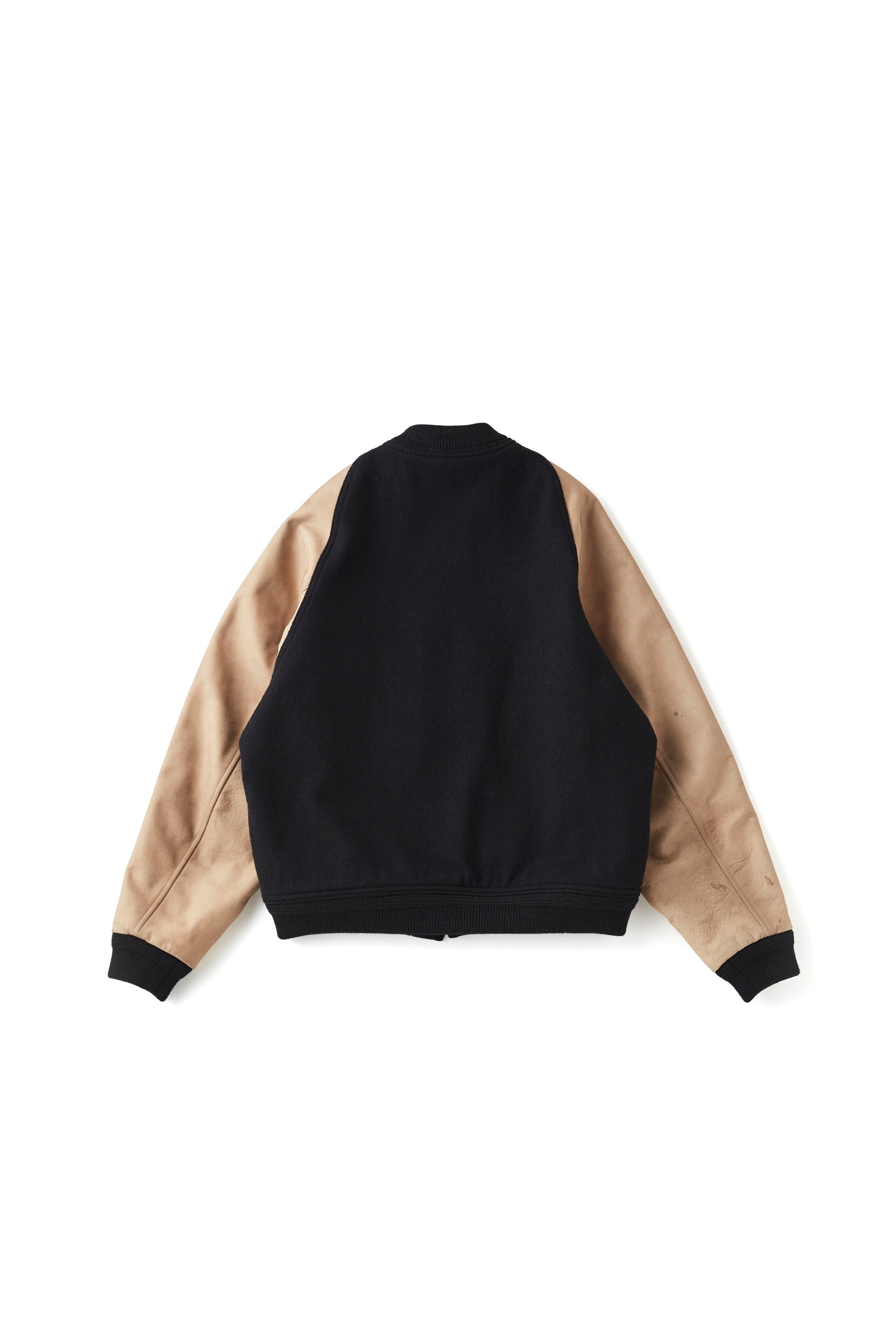 フロントボタンタイプのアワードジャケット。レターの着かない簡素なデザインの中に冴え渡る古き良きアスレチックアーカイブピースからインスパイアされた意匠設計と、現代的な解釈で製作されたブークレーメルトンがモダンな佇まいとなります。ユニークなラインを見せるラグラン切り替え、2種のウールをブレンドさせて編み立てたブークレーニットパーツ、3枚のパーツにより構成される立体的なスリーブはシュリンク作業を施したカウスキンを用いて組み立てられ、その後一点一点、手作業により味だしされます。また襟、裾リブ接ぎ箇所に見られるテープ仕様も今では見られないユニークなディテールとなり、このプロダクトの存在価値を引き立ててくれます。原糸に表情のあるリング糸とタスマニアカシミアの混紡糸を使用。織組織をツイルではなくブロークンツイルにすることで、規則的な綾目が見えず不規則な見え方が特徴。仕上げは縮絨をさせて縮ませ、適度な肉感を表現。