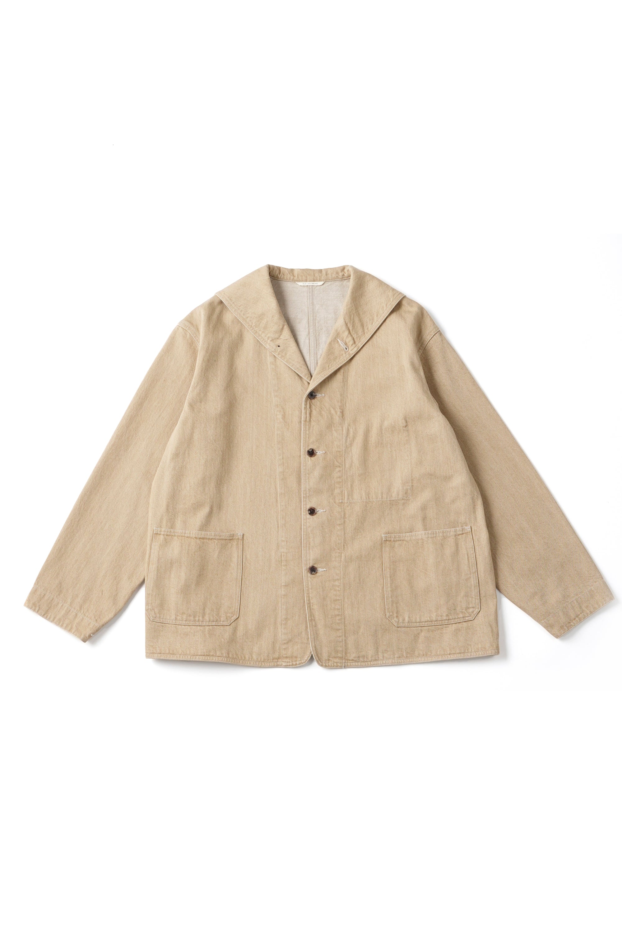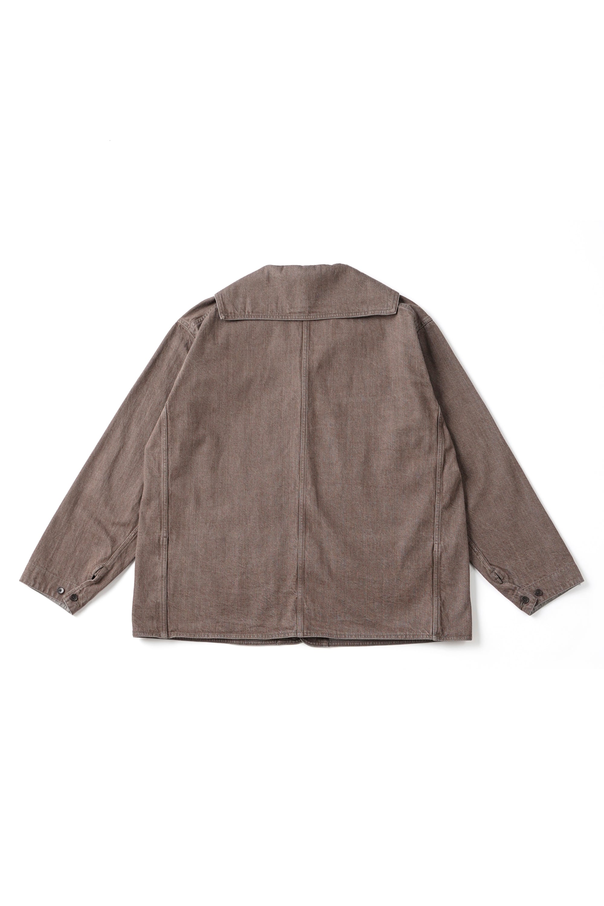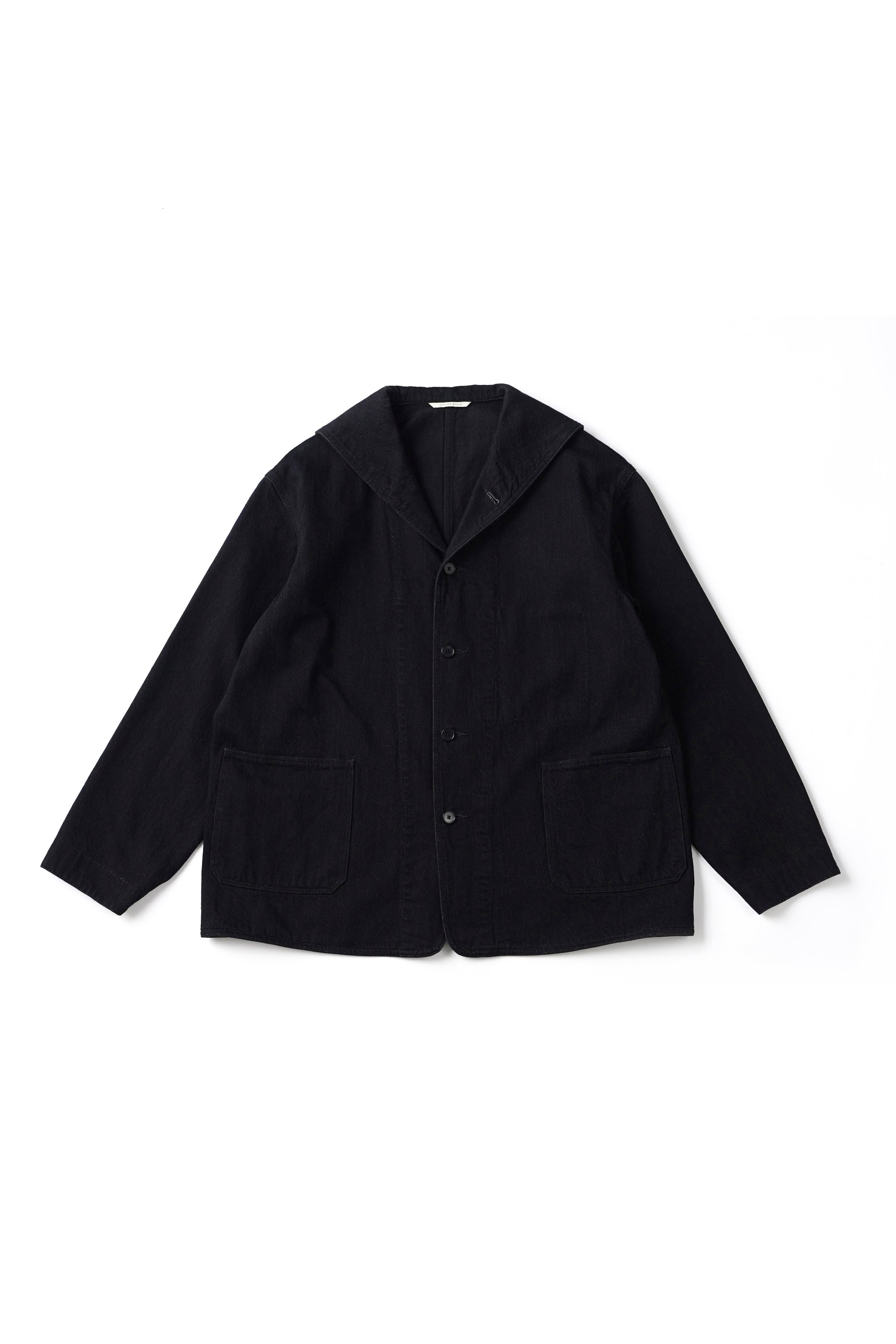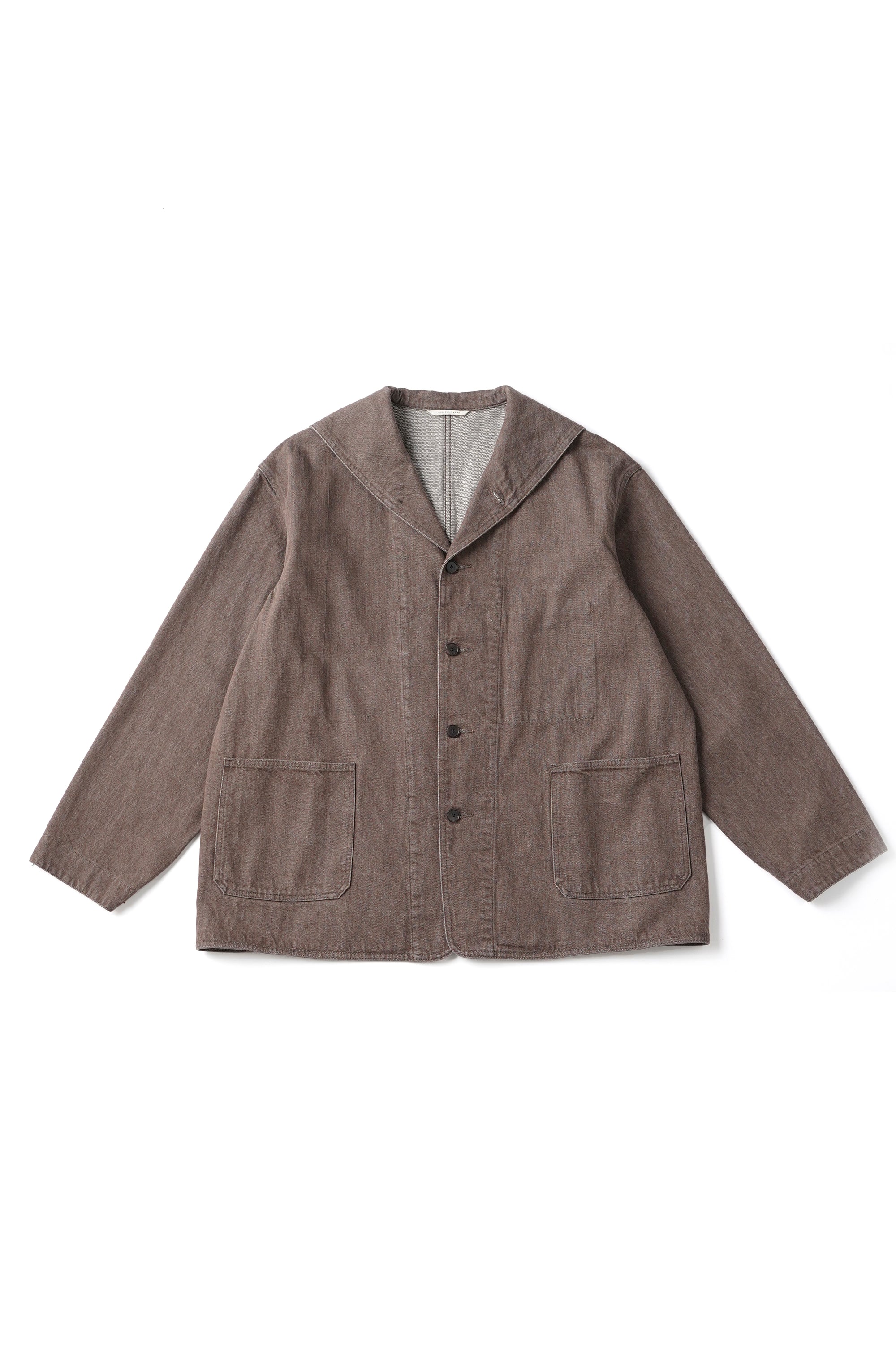 小振りなセーラーカラーが特徴的なカバーオールジャケット。いわゆる水兵達のユニフォームの様な大袈裟なセーラーカラーとは違いショールカラーを変形させたかのような小振りな襟のデザインは、古い時代のアーカイブをベースに再構築されたオリジナルデザイン。デザインとマテリアルの好相性なマッチングは、洗練された表情を醸し出す。経緯とも別注のムラ糸を引いており、原綿はトルコのオーガニックコットン100%使用。GOTS認証プログラムに合格した製造工程で生産された原綿で、綿花畑及びジン工程ともにオーガニックコットン以外の原綿が混入しないように厳選された管理基準をクリアした原綿となっております。紡績でもナチュラルムラを最新式のコンピュータ制御で再現しております。一般的なスラブ糸ではなく、ランダムにムラの長さとボリュームを表現しており周期的なムラ感ではなく、自然なムラ感となります。紡績工程でも、太番手を紡績するために、あえて細番手も紡績できる原綿を使用して紡績しております。よって、さらに高級感のある表情感になっております。経緯と太番手ですが、緯糸の打込本数を程よく調整しているので硬くなりすぎない、しなやかで絶妙なクオリティなデニムに仕上がっています。
