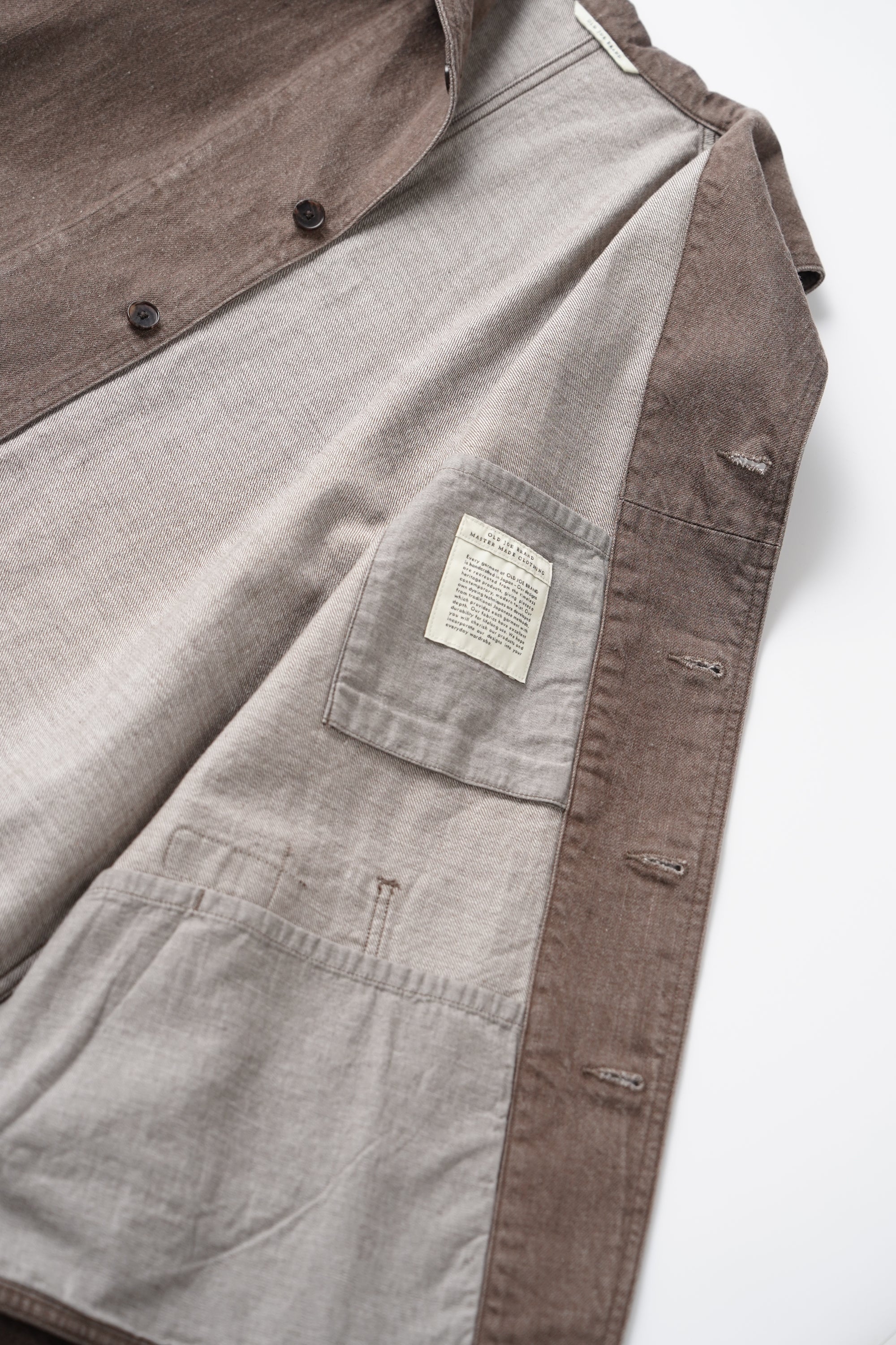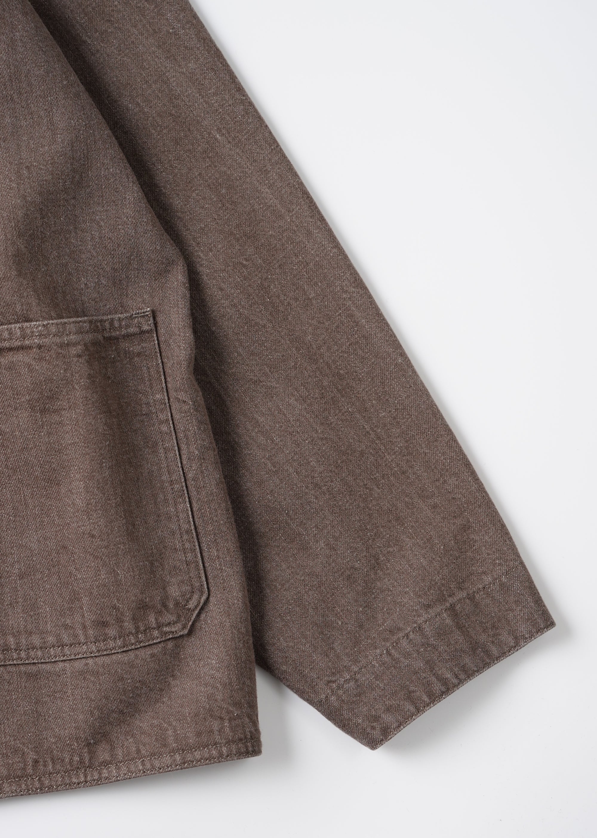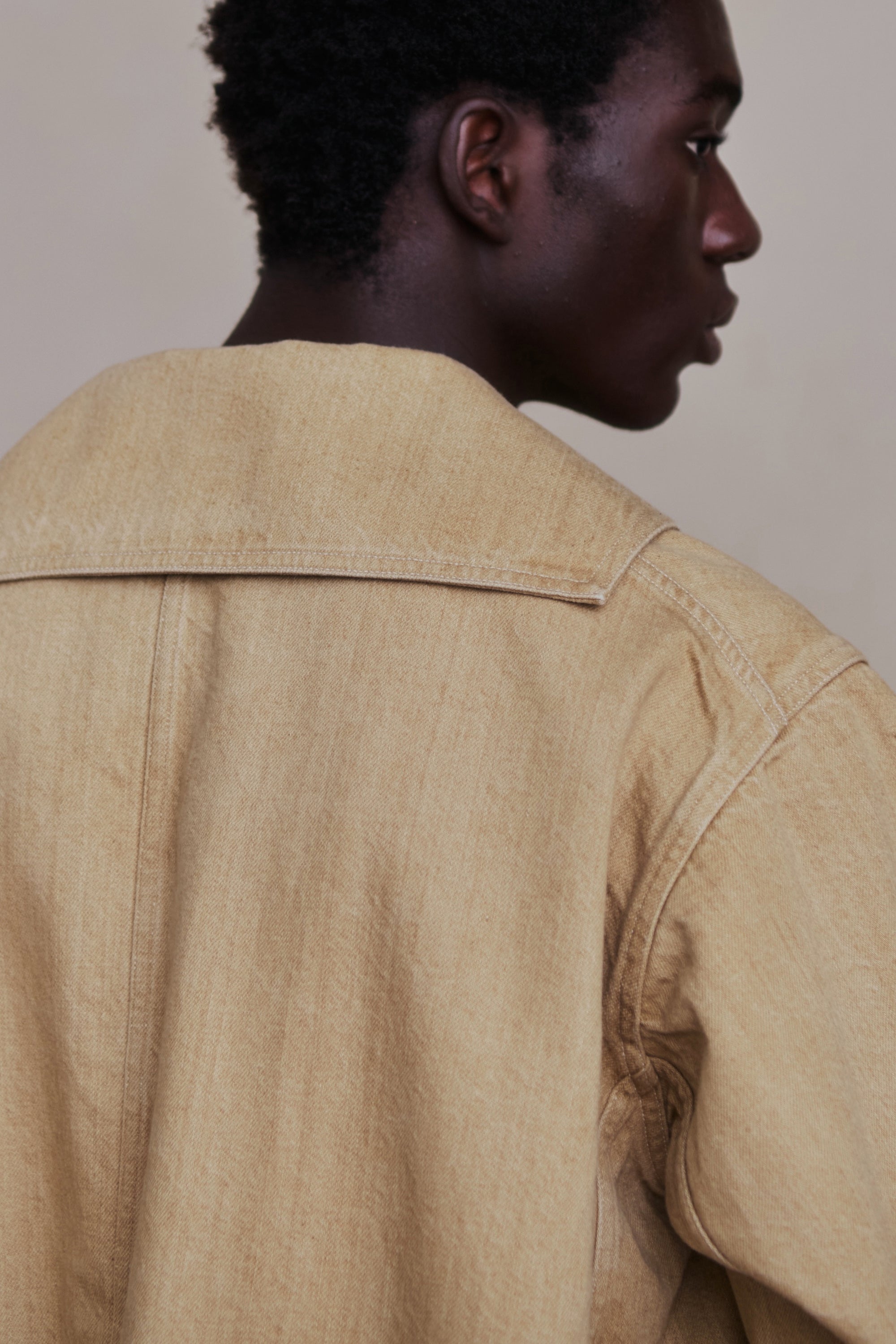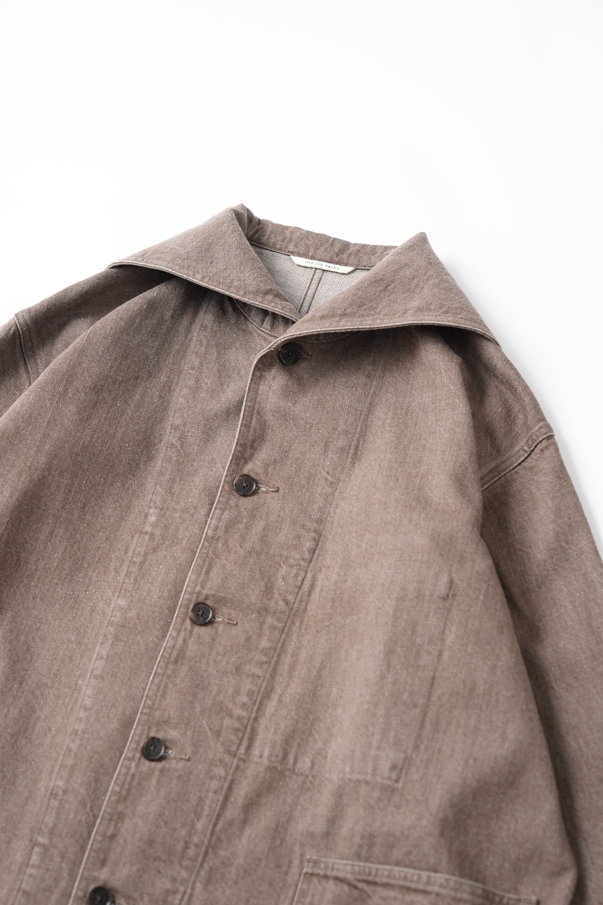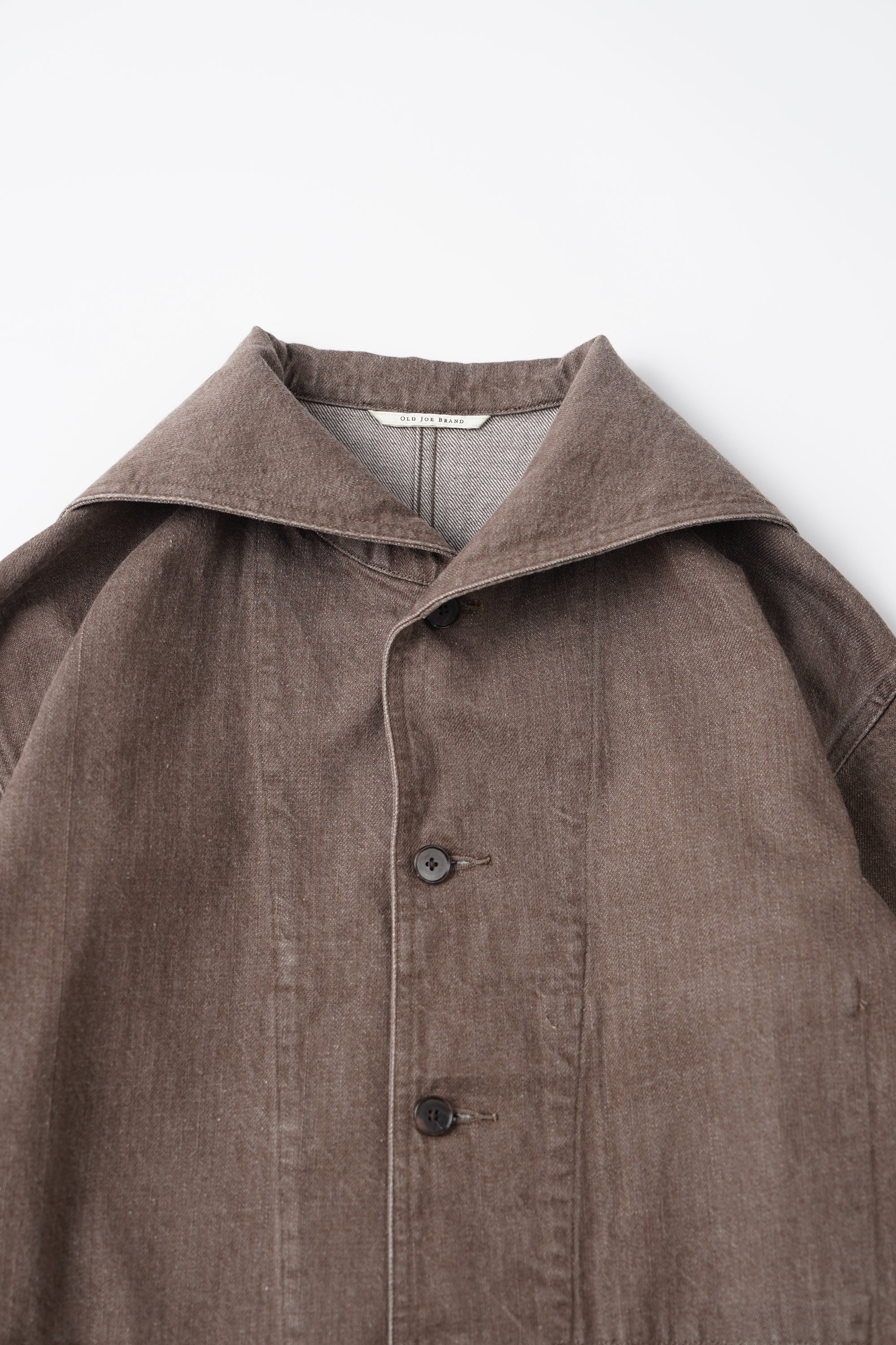 小振りなセーラーカラーが特徴的なカバーオールジャケット。いわゆる水兵達のユニフォームの様な大袈裟なセーラーカラーとは違いショールカラーを変形させたかのような小振りな襟のデザインは、古い時代のアーカイブをベースに再構築されたオリジナルデザイン。デザインとマテリアルの好相性なマッチングは、洗練された表情を醸し出す。経緯とも別注のムラ糸を引いており、原綿はトルコのオーガニックコットン100%使用。GOTS認証プログラムに合格した製造工程で生産された原綿で、綿花畑及びジン工程ともにオーガニックコットン以外の原綿が混入しないように厳選された管理基準をクリアした原綿となっております。紡績でもナチュラルムラを最新式のコンピュータ制御で再現しております。一般的なスラブ糸ではなく、ランダムにムラの長さとボリュームを表現しており周期的なムラ感ではなく、自然なムラ感となります。紡績工程でも、太番手を紡績するために、あえて細番手も紡績できる原綿を使用して紡績しております。よって、さらに高級感のある表情感になっております。経緯と太番手ですが、緯糸の打込本数を程よく調整しているので硬くなりすぎない、しなやかで絶妙なクオリティなデニムに仕上がっています。