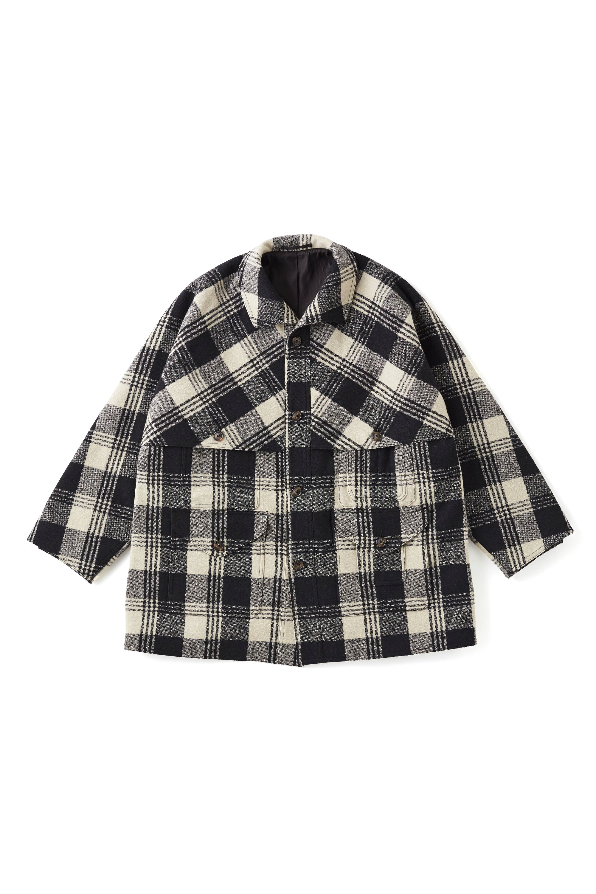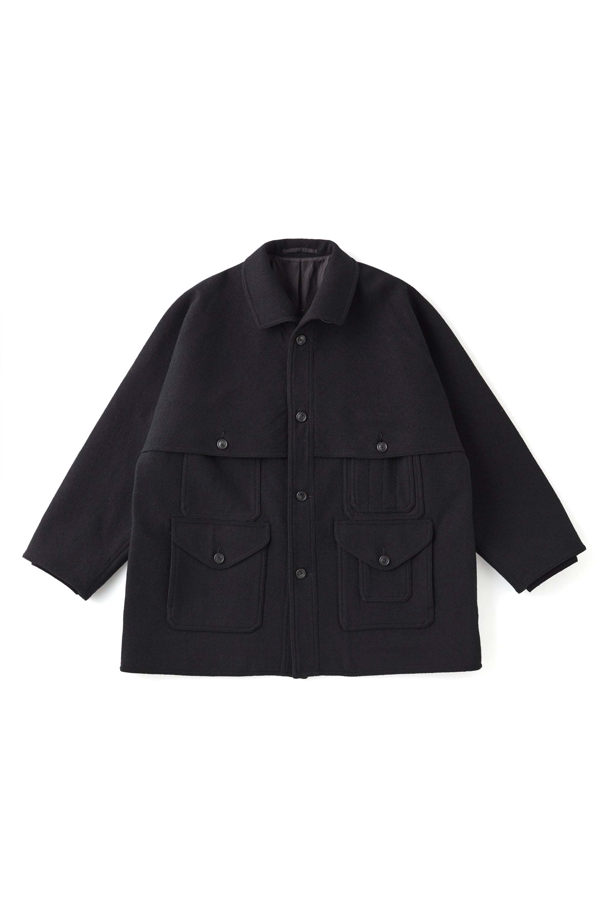 ハンティングウェアの代表的なデザインであるダブルヨーク&スリーブ、ゲームポケットを配し、見返しから弧を描くように設計された小振りなワンピースカラーが美しい。また襟はボタンを備えているので、スタンドカラーとしての側面も併せ持っています。ブークレーヤーンを用いて織り上げたメルトンは不均一かつモダンな表情を持っており都市生活者のためのコンフォタブルなフィッティングラインは、アーカイブピースの持つそれとは別物でとても品の良い佇まいを見せる。原糸に表情のあるリング糸とタスマニアカシミアの混紡糸を使用。織組織をツイルではなくブロークンツイルにすることで、規則的な綾目が見えず不規則な見え方が特徴。仕上げは縮絨をさせて縮ませ、適度な肉感を表現。