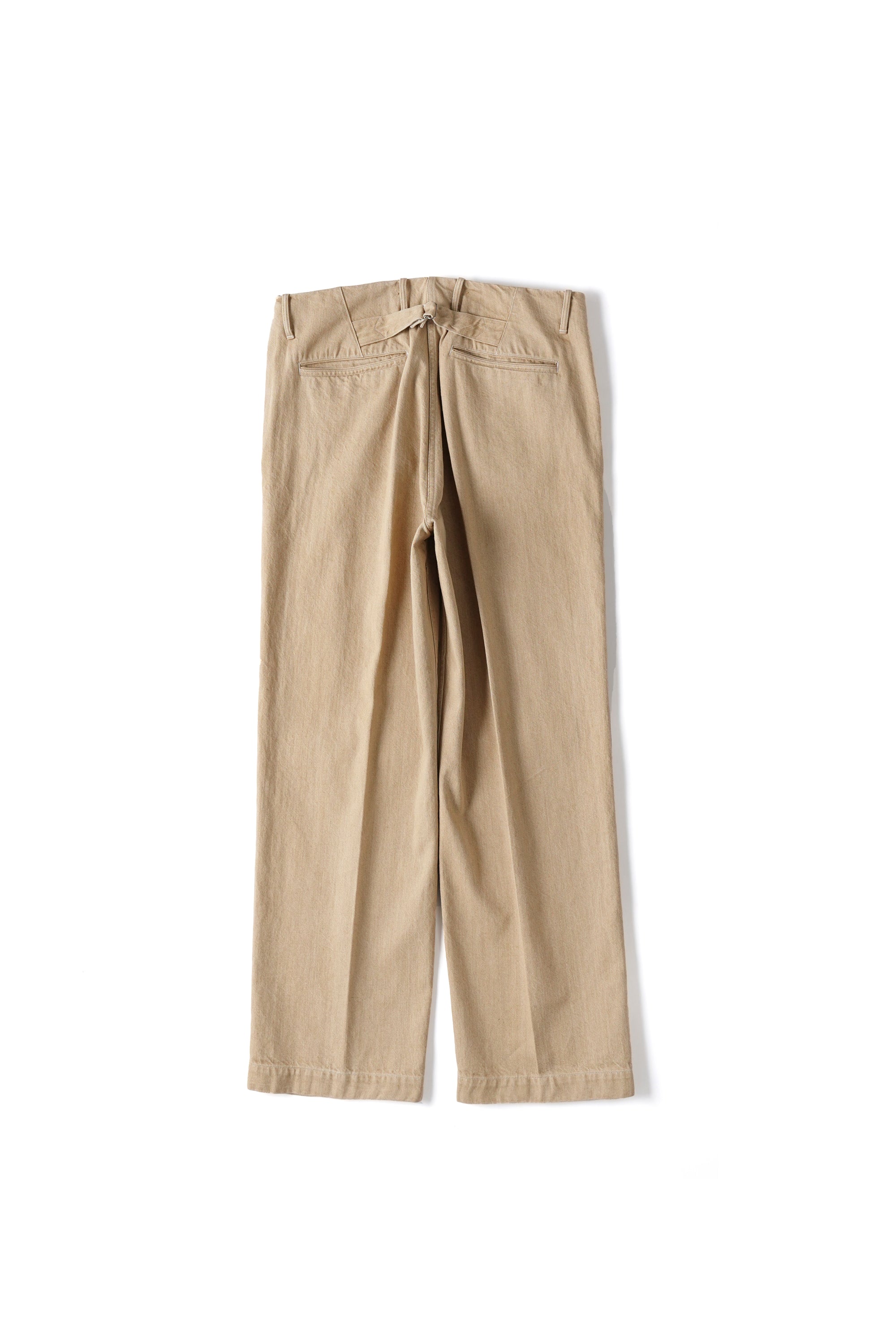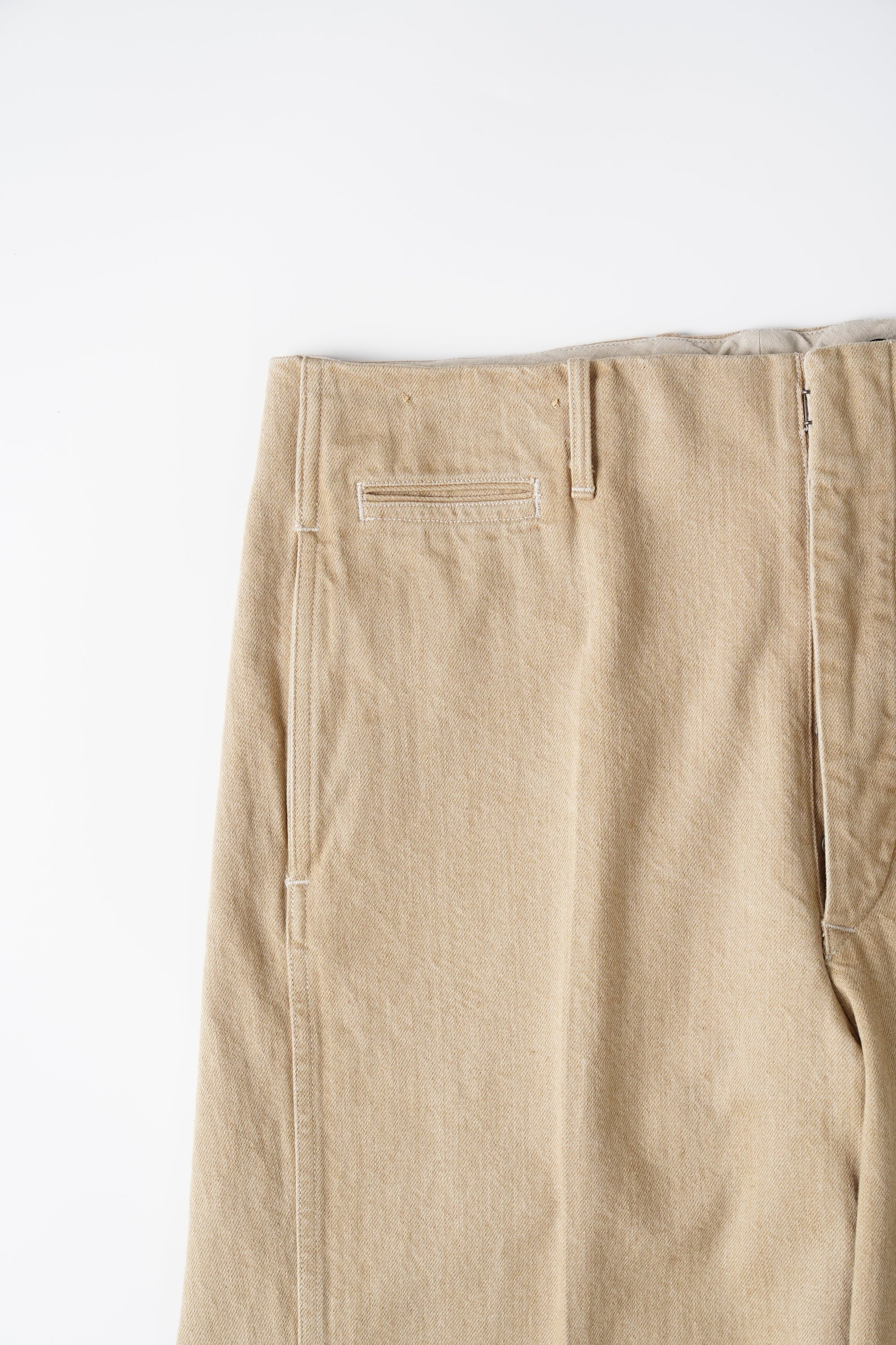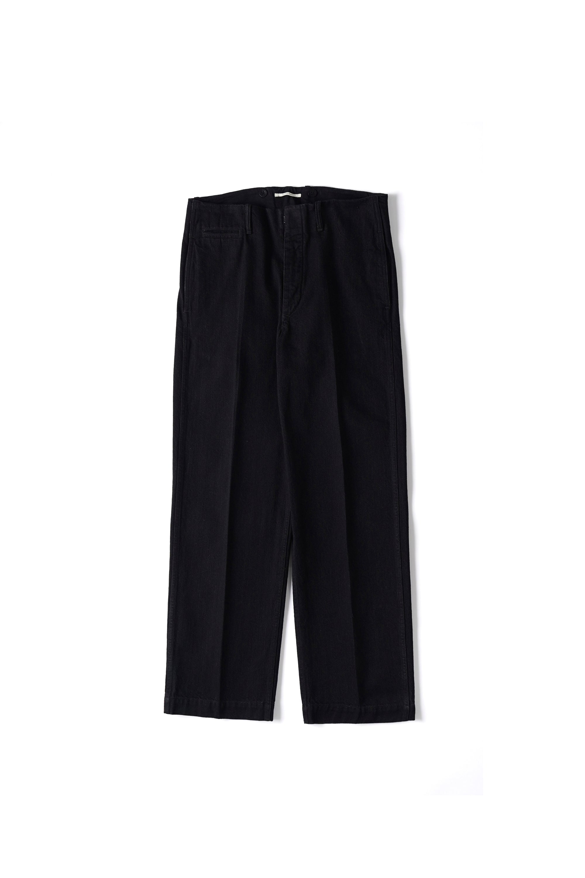 アーリーセンチュリー期のミリタリートラウザーの意匠設計、仕立てが盛り込まれたテーラード感に溢れたスラックス。高い技術力を要するモミ玉ポケット、ダーツに仕舞い込んだシンチバックなど、簡素でシンプルな中に冴え渡る職人技。幅広の裾までストレートに落ちるシルエットはヘリテージかつモダンな空気感を纏う。経緯とも別注のムラ糸を引いており、原綿はトルコのオーガニックコットン100%使用。GOTS認証プログラムに合格した製造工程で生産された原綿で、綿花畑及びジン工程ともにオーガニックコットン以外の原綿が混入しないように厳選された管理基準をクリアした原綿となっております。紡績でもナチュラルムラを最新式のコンピュータ制御で再現しております。一般的なスラブ糸ではなく、ランダムにムラの長さとボリュームを表現しており周期的なムラ感ではなく、自然なムラ感となります。紡績工程でも、太番手を紡績するために、あえて細番手も紡績できる原綿を使用して紡績しております。よって、さらに高級感のある表情感になっております。経緯と太番手ですが、緯糸の打込本数を程よく調整しているので硬くなりすぎない、しなやかで絶妙なクオリティなデニムに仕上がっています。