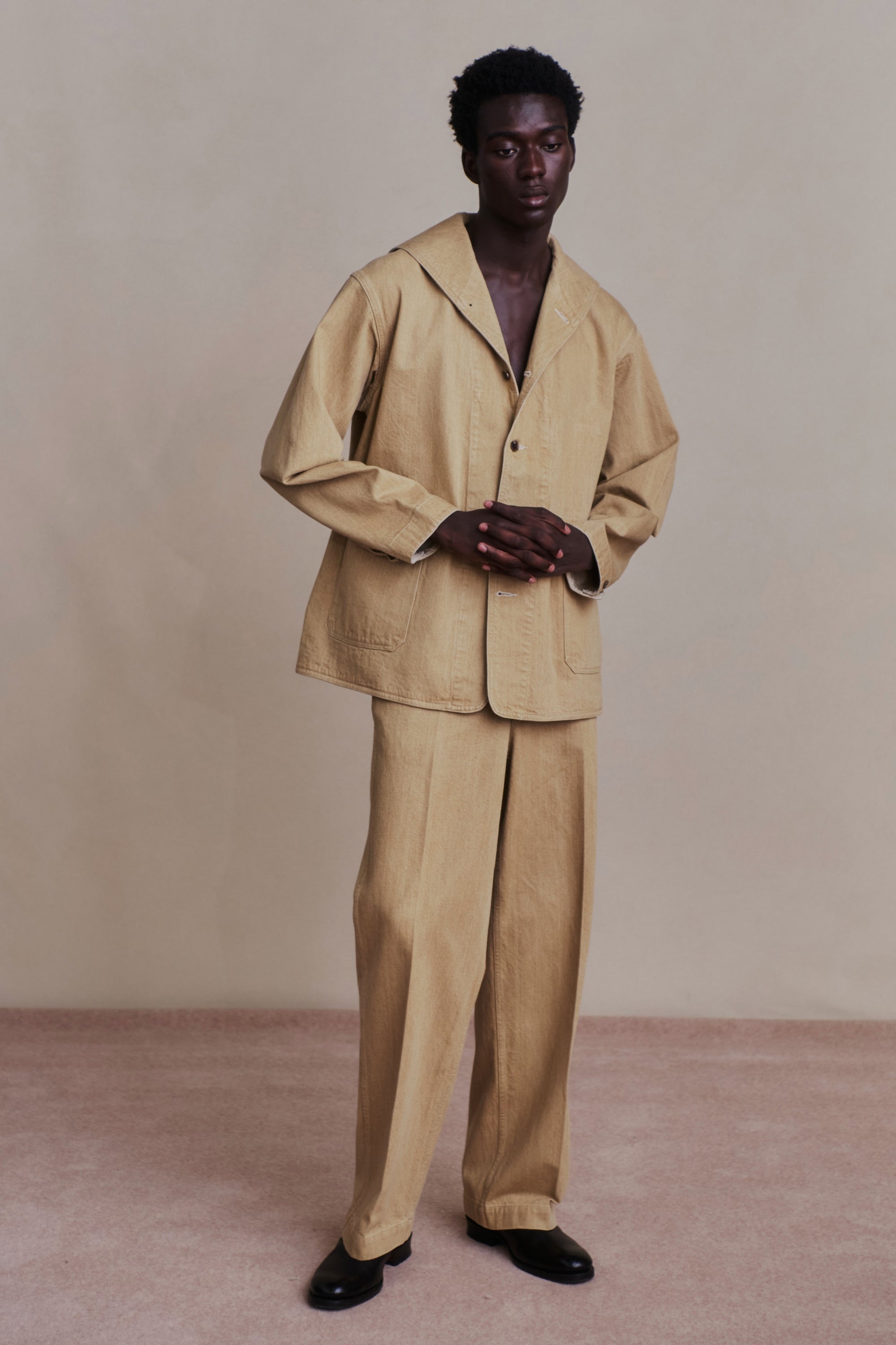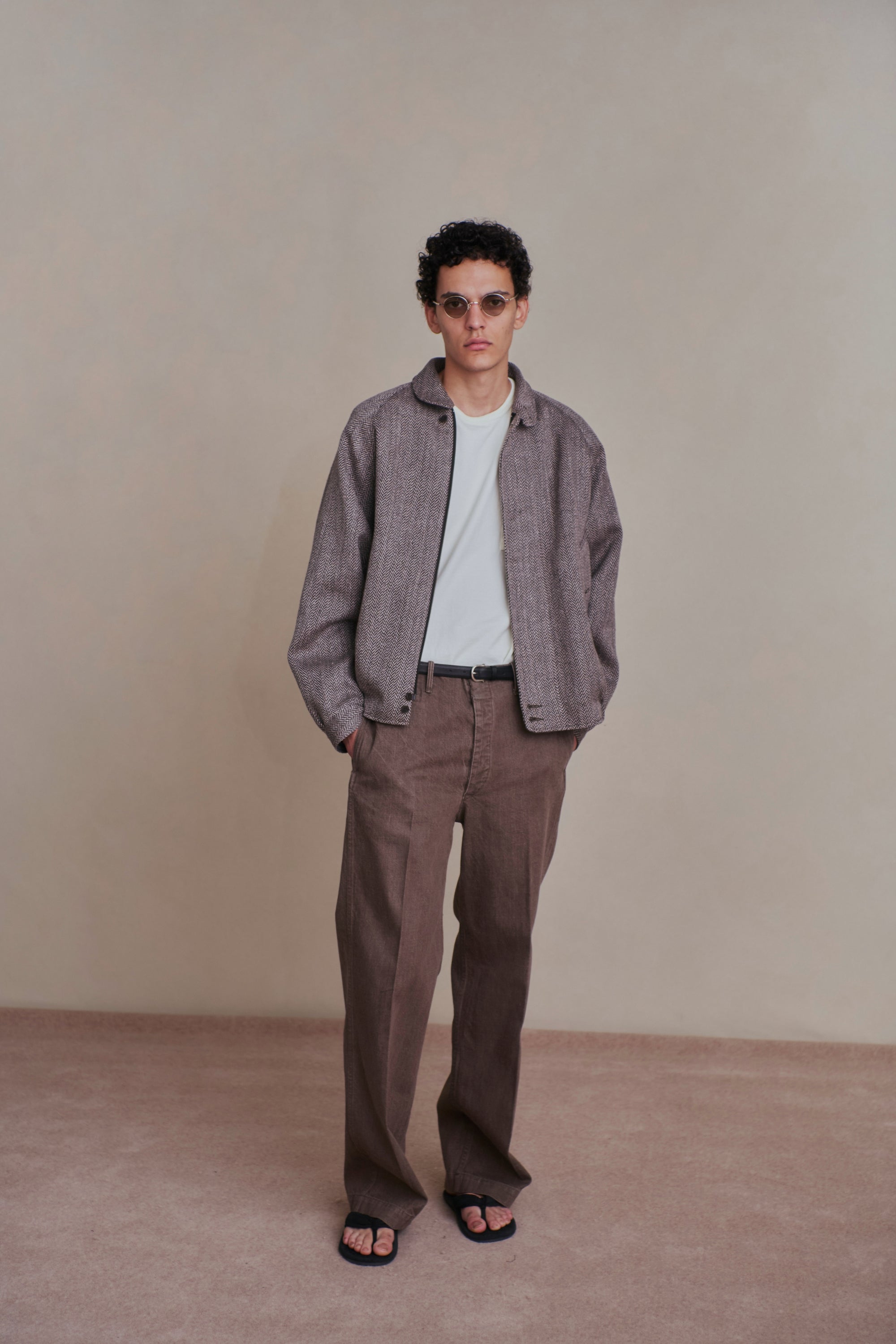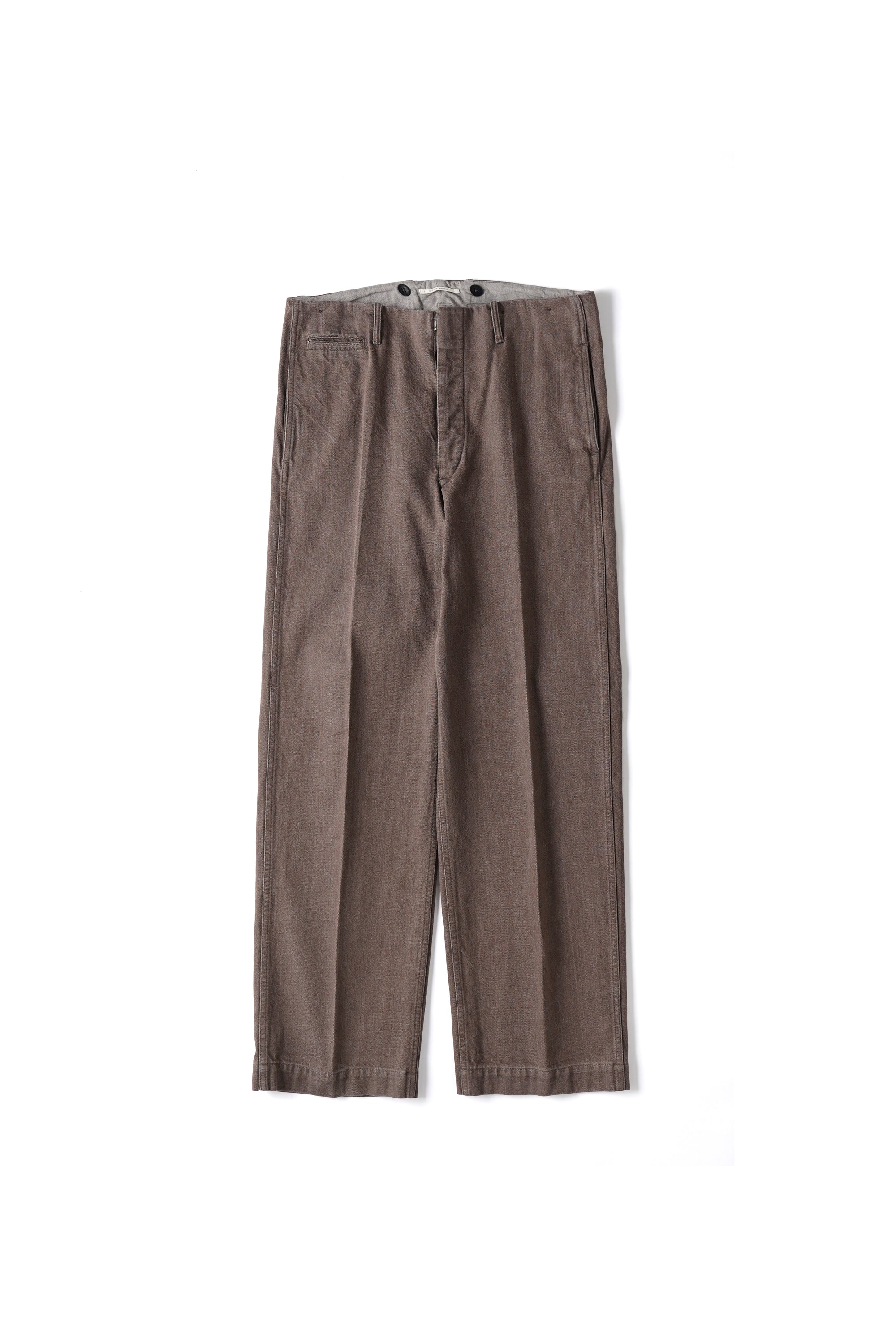 アーリーセンチュリー期のミリタリートラウザーの意匠設計、仕立てが盛り込まれたテーラード感に溢れたスラックス。高い技術力を要するモミ玉ポケット、ダーツに仕舞い込んだシンチバックなど、簡素でシンプルな中に冴え渡る職人技。幅広の裾までストレートに落ちるシルエットはヘリテージかつモダンな空気感を纏う。経緯とも別注のムラ糸を引いており、原綿はトルコのオーガニックコットン100%使用。GOTS認証プログラムに合格した製造工程で生産された原綿で、綿花畑及びジン工程ともにオーガニックコットン以外の原綿が混入しないように厳選された管理基準をクリアした原綿となっております。紡績でもナチュラルムラを最新式のコンピュータ制御で再現しております。一般的なスラブ糸ではなく、ランダムにムラの長さとボリュームを表現しており周期的なムラ感ではなく、自然なムラ感となります。紡績工程でも、太番手を紡績するために、あえて細番手も紡績できる原綿を使用して紡績しております。よって、さらに高級感のある表情感になっております。経緯と太番手ですが、緯糸の打込本数を程よく調整しているので硬くなりすぎない、しなやかで絶妙なクオリティなデニムに仕上がっています。