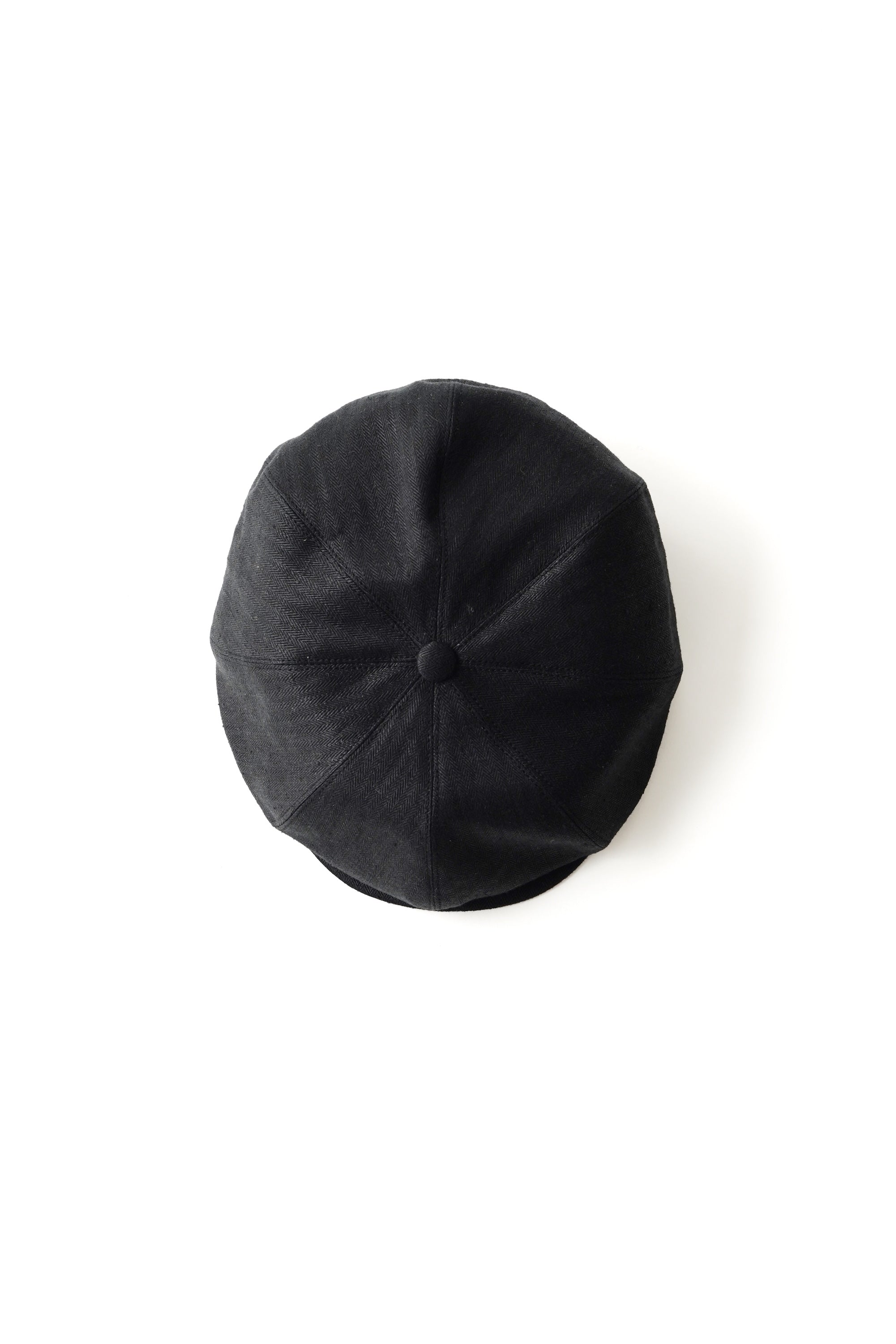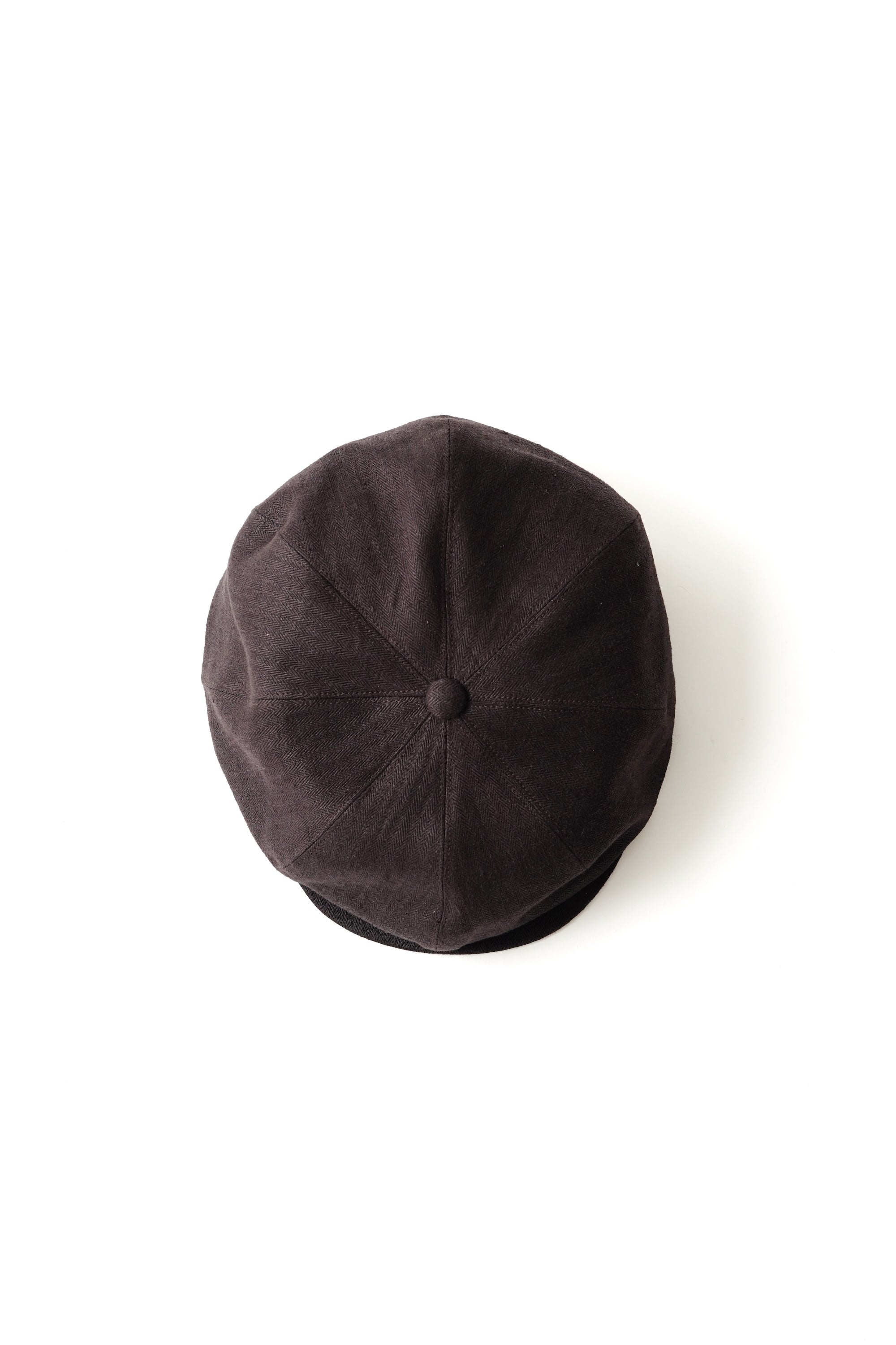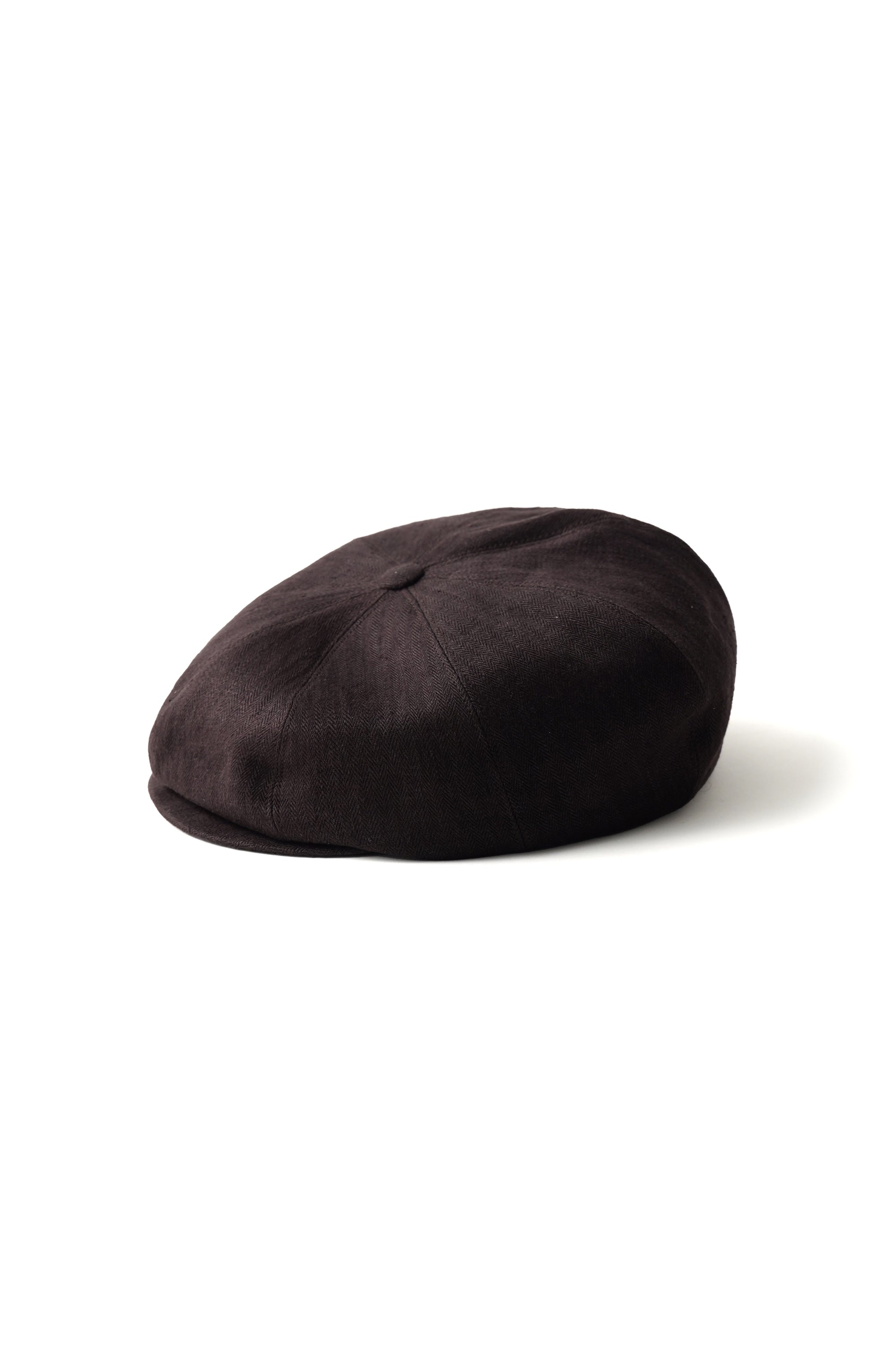 私たちを代表するコレクションピース。クラシックディテールをベースに持ちつつ、コンテンポラリーフィットに仕上げたピークドキャスケット。1910〜30年代のイメージソースで制作されるこのピースは、 シルエットの構築も幾度となく修正を繰り返して完成したオリジナルのフィットとなります。被った時の前傾角度や、ツバのサイズ感、フロントに流した時の布のたまり分量、 サイドの膨らみなど、野暮ったくならず美しに見えるようにと設計されています。縦糸緯糸共にフランス原料のリネンを使用。組織は通常のヘリンボンですが、打ち込み密度を限界まで上げて織り上げています。整経するだけでもかなりの技術を要し、打ち込みもその日の環境、糸の質を考慮して微調整しながら生産しています。加工の前処理においてもかなり難易度の高い生地なのでゆっくりと丁寧に何度も精錬を行い、仕上げにもシリコンを浸透させて反発の有る風合いに仕上げております。