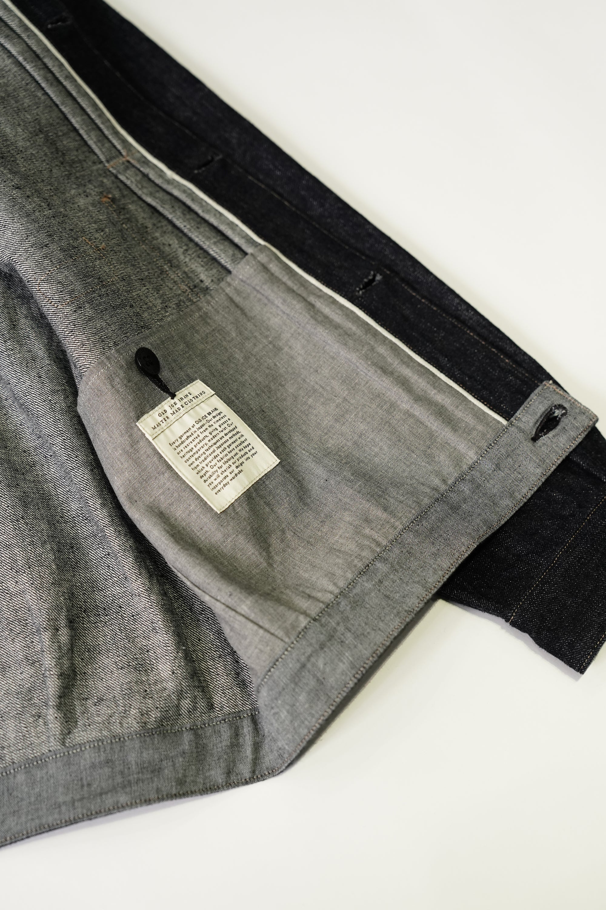 私たちのシグネチャーのデニムをベースに日本の伝統的なテクニックに倣い、古き良き美しい日本の原風景を刺繍したプロダクト。私たちのデニムジャケットは、所謂なデザイン、縫製仕様、パターンとは異なり、シャツのような綺麗に返りのついたポインテッドカラーが品の良い佇まいとなります。またライニングに配された大振りなポケットや、袖口のセルビッジのマチ仕様など、細かなオリジナルディテールが盛り込まれています。12.4oz OLDJOE original denim 糸から拘り、オリジナルのバルキーさを表現し、ラスティックなネップ感を入れ込み、デニムの産地、井原にて製作しています。経糸にムラ、ネップ形状の強いものを黒味の強いインディゴ染料で染色し、ヨコ糸は比較的ベージュ味の綿を厳選し強撚をかけて糸にしております。生地はいわゆるキバタと言われる織り上がった状態のものから、特殊な方法でサンフォライズ(防縮加工)のみをかけています。通常の防縮方法とは違いますのでいわゆるリジッドデニムと呼ばれる表面にノリが付着した固い生地にはならず柔らかな手触りを表現しました。風合いや色味の重厚感、実際手に取った時の質感や、着用時の履きやすさ、糸使いも含めて、OLDJOEならではのプリミティブかつモダンな存在感を持ったオリジナルデニム。