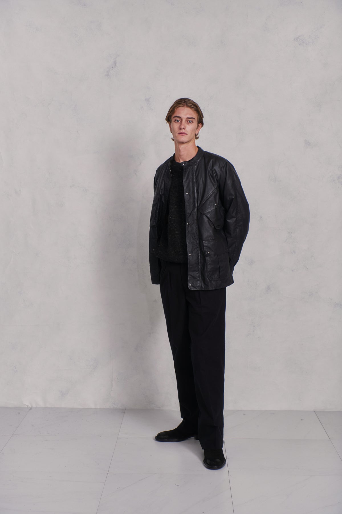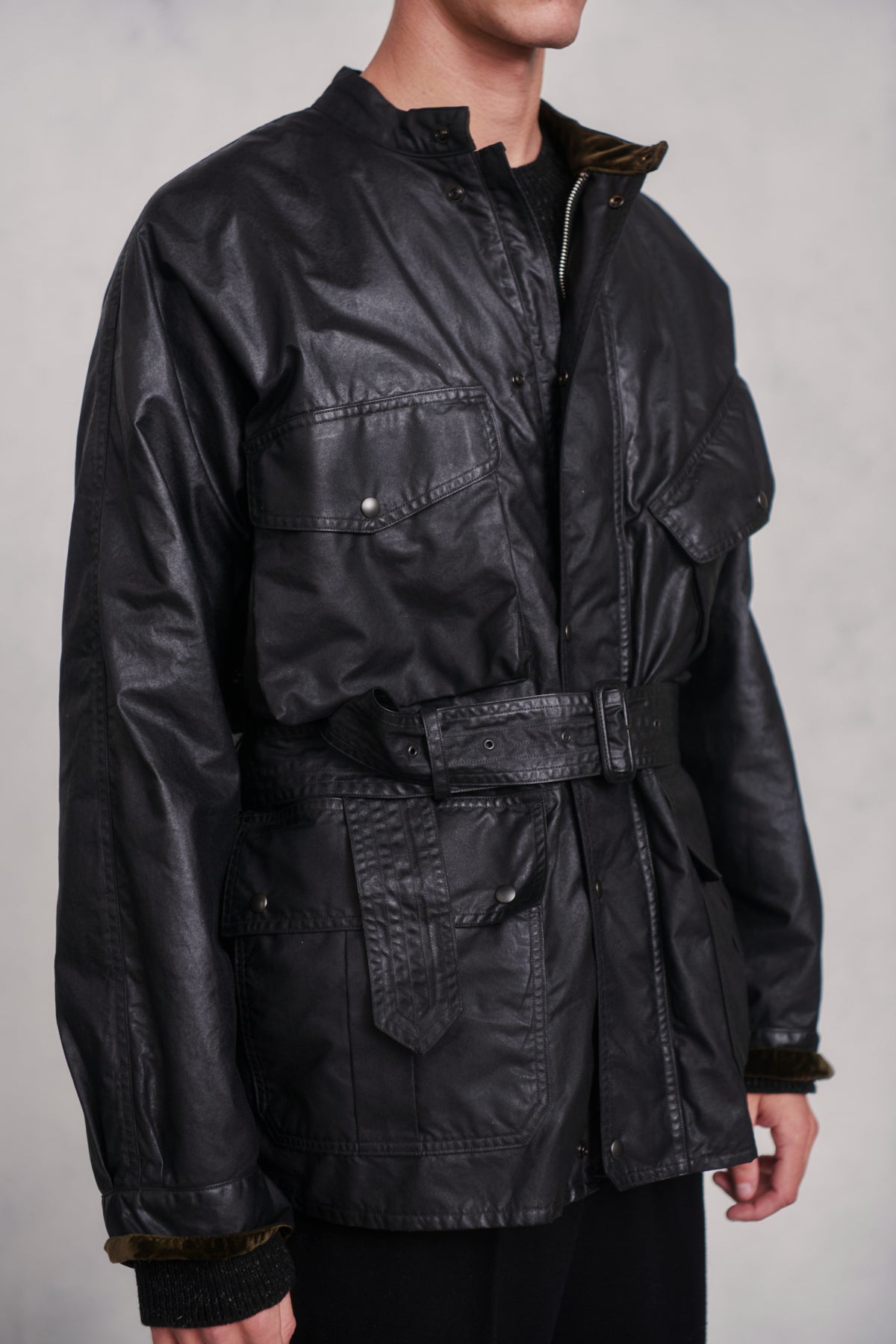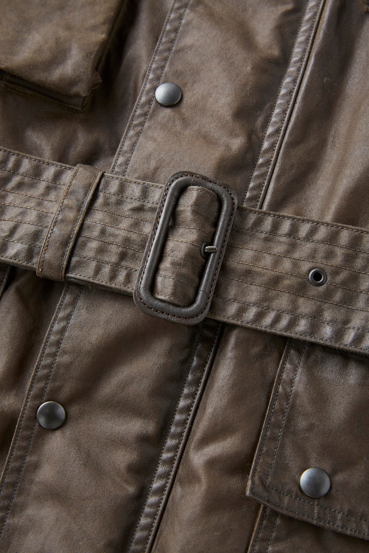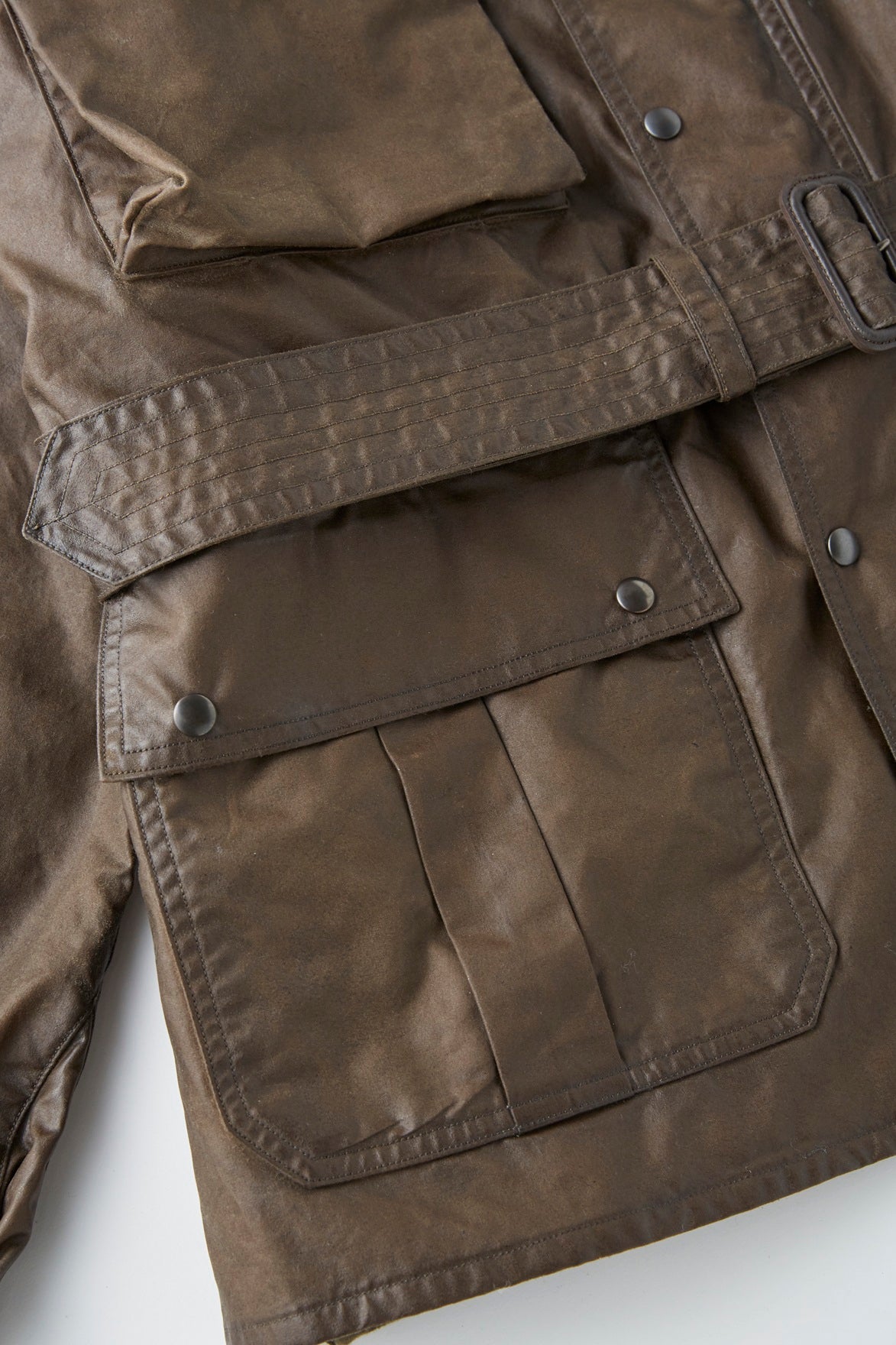 ブリティッシュワックスドジャケットのアーカイブからのインスパイア。ミリタリーなどタフなシーンで使用されていたこのアーカイブピースは、アームホールを無くして袖巾を広く取ったドルマンスリーブが目を引くディテールとなっています。胸に配されたマップポケットは斜めにレイアウトされており機能的な設計となります。前見頃にならぶ全てのポケットもたっぷりとマチを取った作りなので、バック要らずのジャケットになるでしょう。またオイルドクロスに施される手作業でのパティーナエイジングは、トライ&エラーを重ねて完成した私たちのオリジナルのレシピになり他にはない味わい深い表情を醸し出しています。