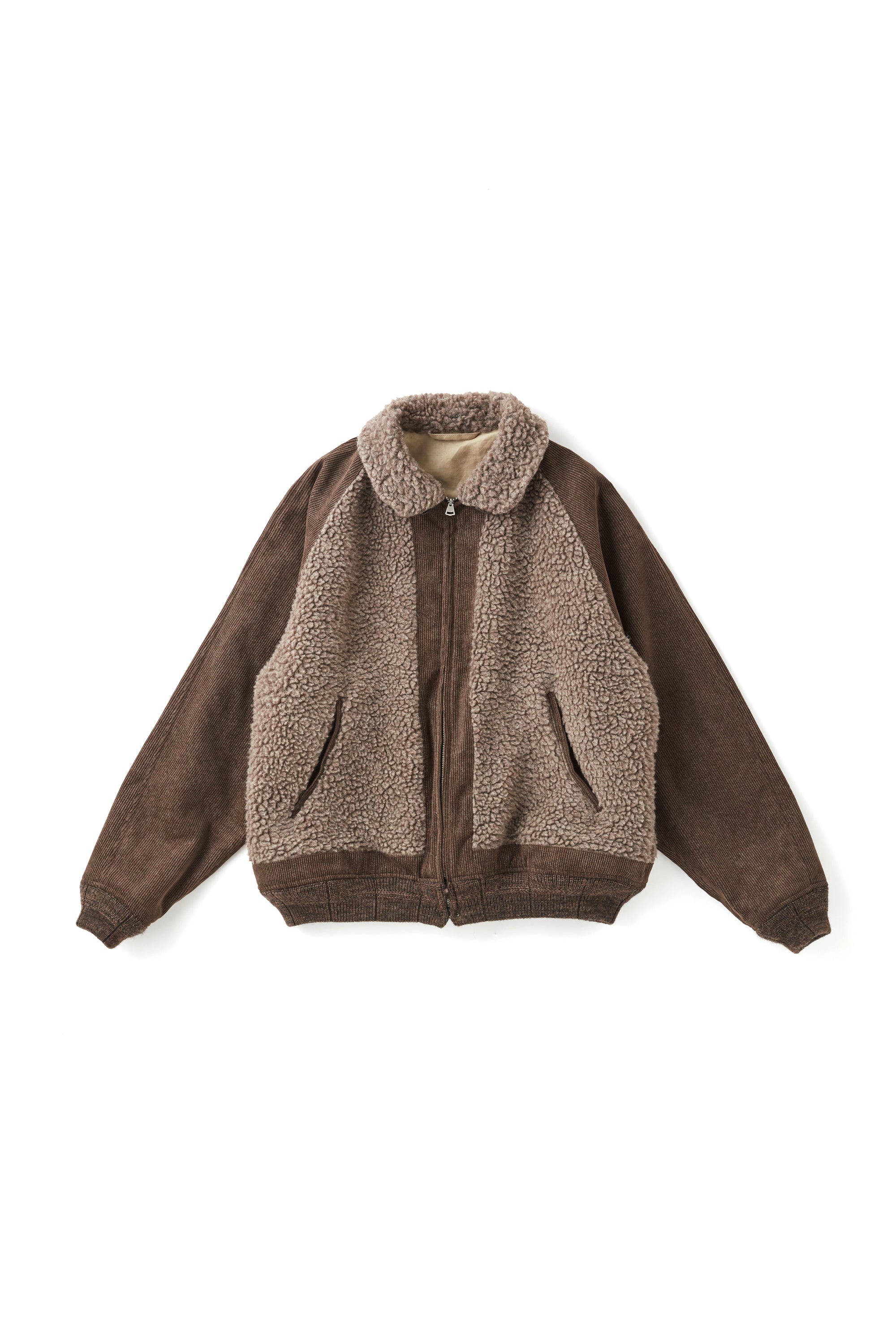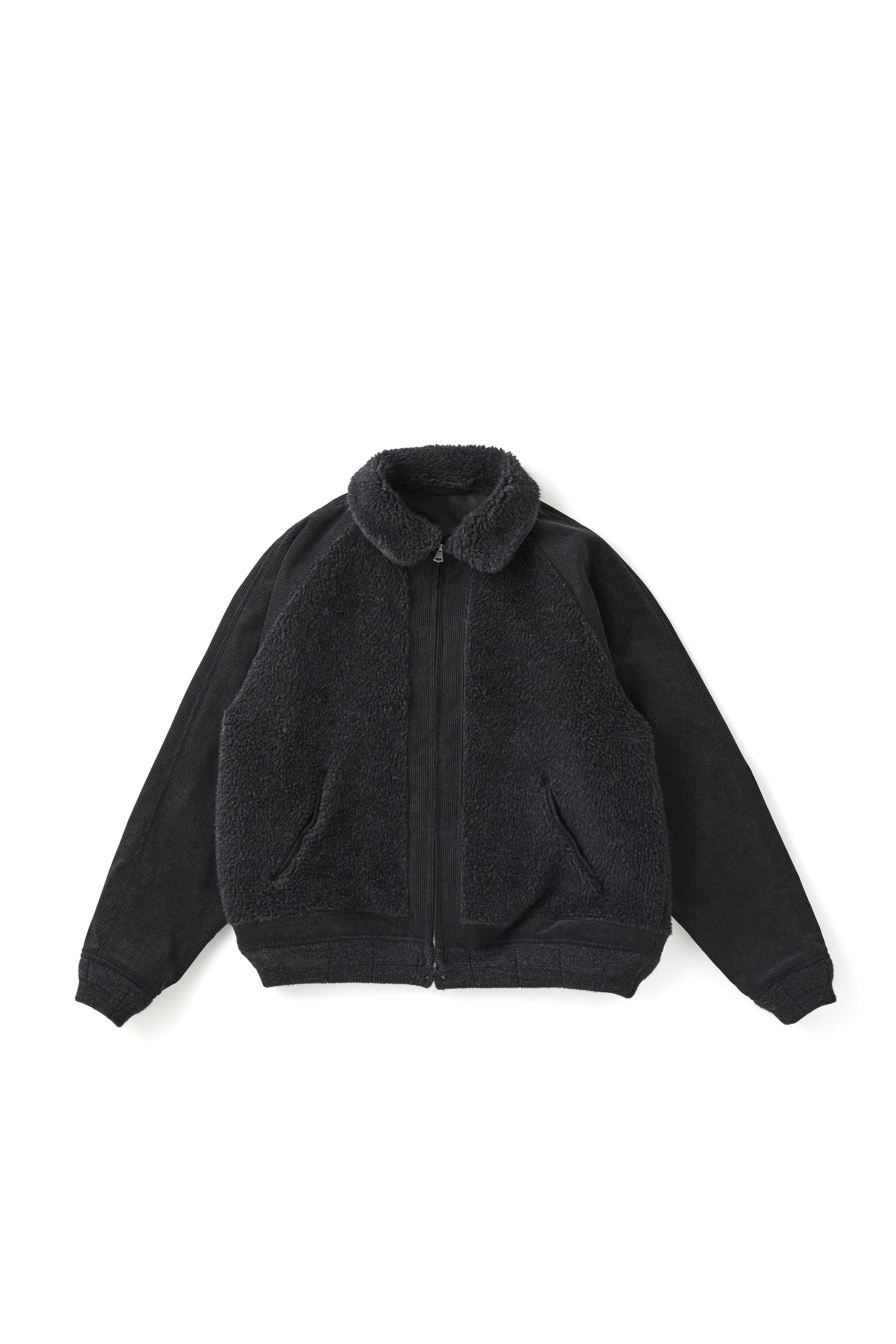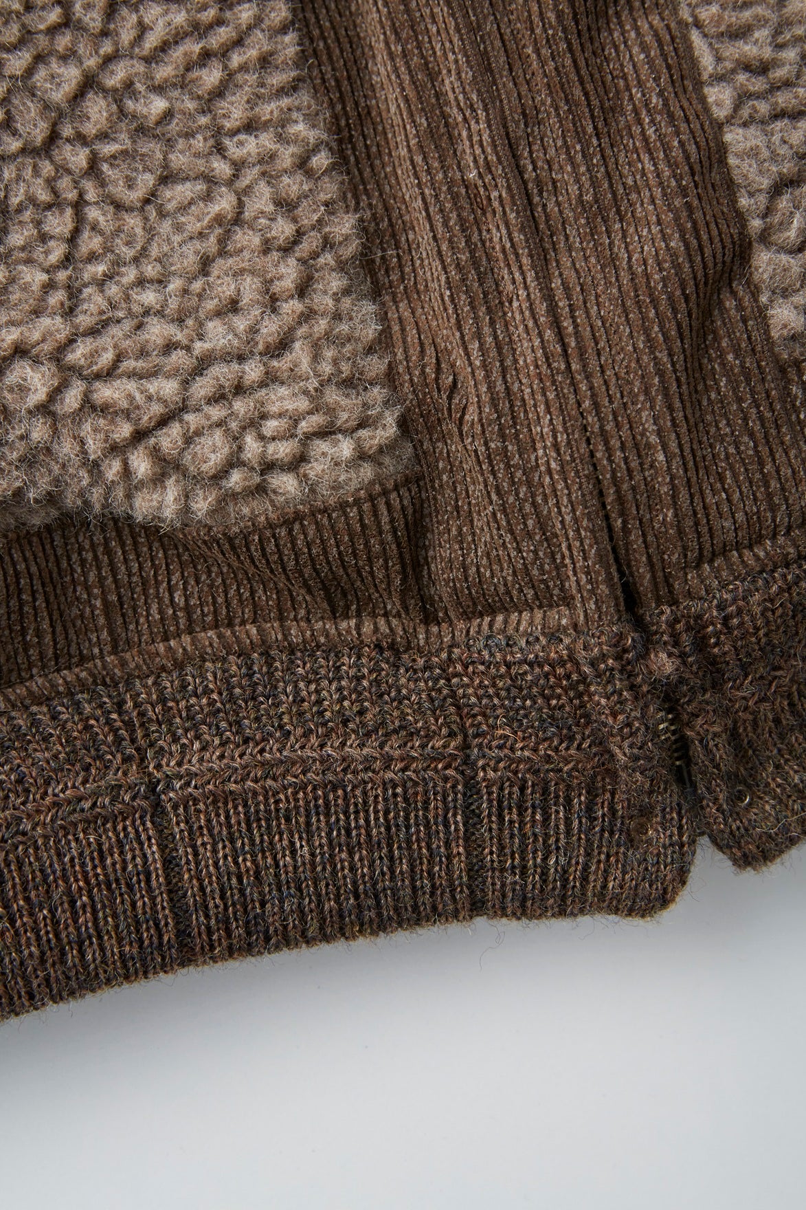 1930年代のヘビーウェアの中でも最も個性的なルックスのシアリングジャケット。オリジナルで製作したプリントコーズを用いて、現代的なムードかつ唯一性が光るように再構築。メインマテリアルの抜染パターンの配色に合わせるようにと、リブは2種のウールをブレンドすることで色の濃淡を表現し奥行きを持たせた。そして針を規則的に抜きクラシカルな表情を作り上げた。またシアリングパーツはウール素材のナチュラルなトップ色を用いて、違和感なく調和しコンフォタブルなフィッティングに。当時のラグジュアリーピースだったグリズリージャケットは現代において鮮度の高いプロダクトとして仕上がった。ロータリー機を使用した抜染プリントを施した高密度のWパイル、10Well中畝コール。高密度でパイル目が細かく発色も深く繊細な色合いが特徴。トライアンドエラーを繰り返しながら調整を行い、柄を表現。繊細でしっとりと柔らかい風合いに仕上げた。