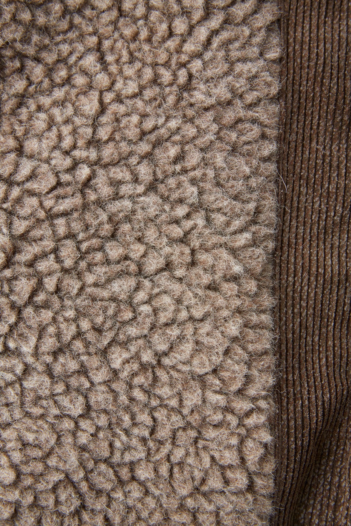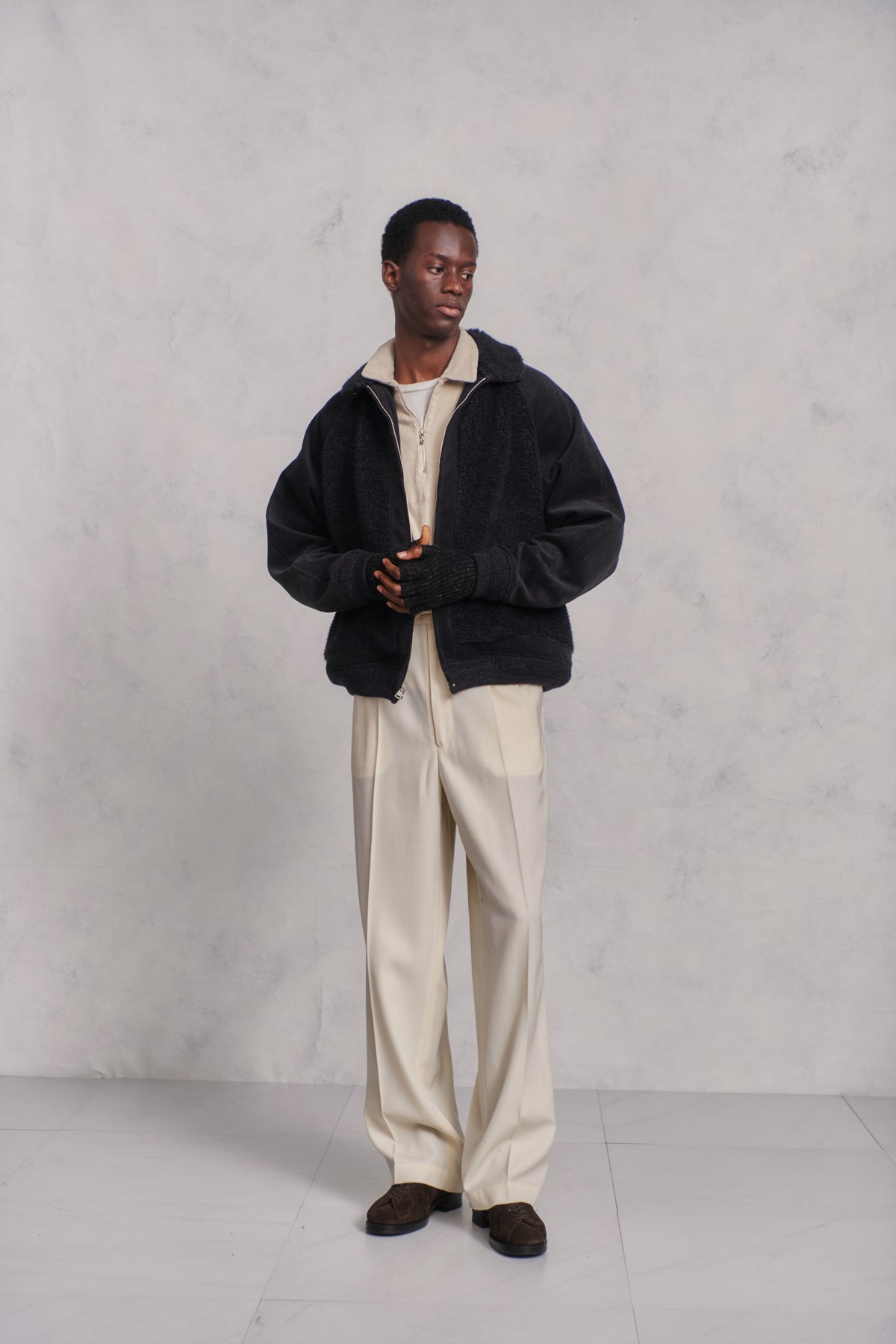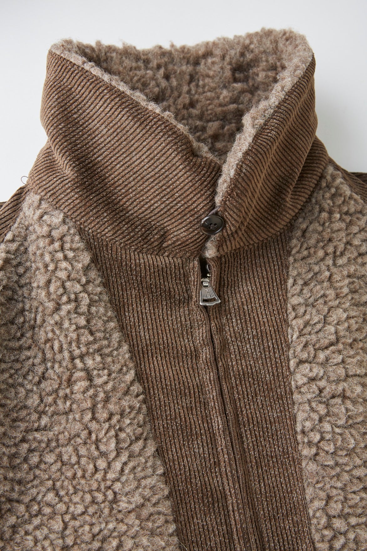 1930年代のヘビーウェアの中でも最も個性的なルックスのシアリングジャケット。オリジナルで製作したプリントコーズを用いて、現代的なムードかつ唯一性が光るように再構築。メインマテリアルの抜染パターンの配色に合わせるようにと、リブは2種のウールをブレンドすることで色の濃淡を表現し奥行きを持たせた。そして針を規則的に抜きクラシカルな表情を作り上げた。またシアリングパーツはウール素材のナチュラルなトップ色を用いて、違和感なく調和しコンフォタブルなフィッティングに。当時のラグジュアリーピースだったグリズリージャケットは現代において鮮度の高いプロダクトとして仕上がった。ロータリー機を使用した抜染プリントを施した高密度のWパイル、10Well中畝コール。高密度でパイル目が細かく発色も深く繊細な色合いが特徴。トライアンドエラーを繰り返しながら調整を行い、柄を表現。繊細でしっとりと柔らかい風合いに仕上げた。