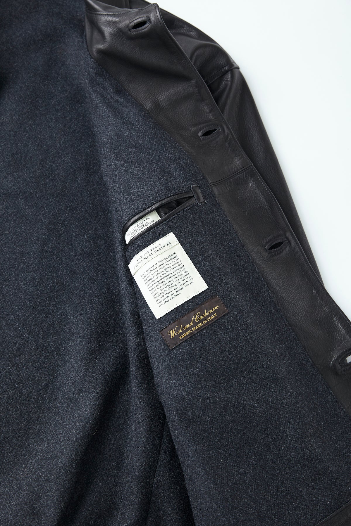 ホースハイドが見せるタフな佇まいとは違い、エレガントで鈍い光沢を放つ最上級のベビーカーフを使用したタイプ。クラシカルなデザインと贅沢な素材のコントラストが、正にOLDJOEらしいプロダクトと言えます。言わずもがなの最高級なマテリアルの持つとろけるような肌触り、しっとりとしたオイル感など、素上げならではの質感と最上級の経年変化を楽しめる。また上質で穏やかな光沢と心地よい手触りが特徴となります。イタリアの名門タンナーのBABYCALF。コンビネーション鞣しでミーリング加工した素上げの表情が特徴で、上質且つ経年変化を楽しめるハイクラスなマテリアル。裏地にはイタリアプラトー地区の、獣毛系素材専業で、原料の選別から一貫生産しているM.T.R.社によって織られるウールカシミア。適度なハリコシもあり、ビーバー仕上げによるソフトな風合いと美しい発色・表面感は随一。