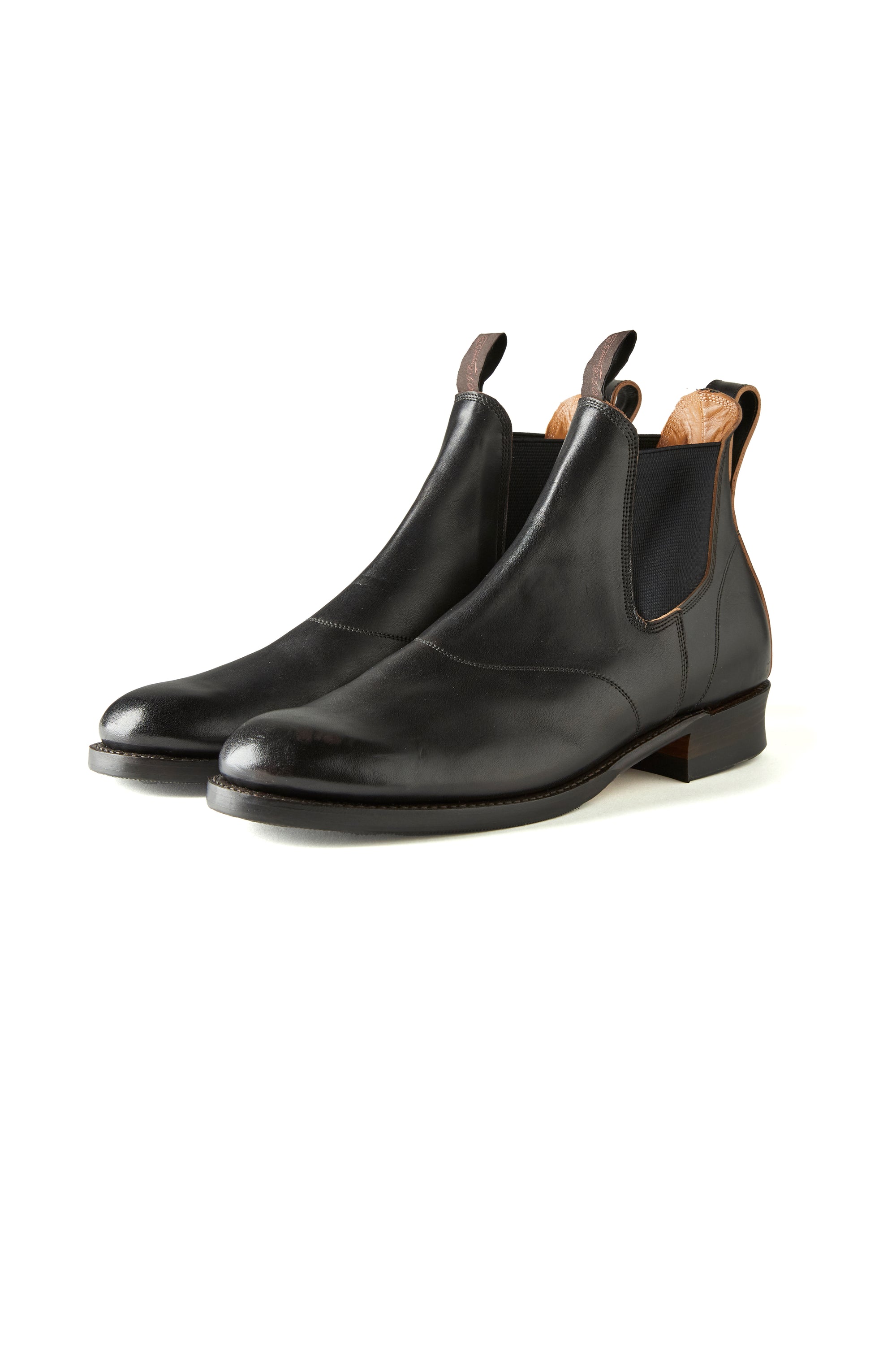 "放浪者"と名付けられた定番のサイドゴアブーツ。サイドゴアブーツは、着脱の容易さから昔はハイキング、ライディングなどのアクティブなシーンの際に用いられる靴でした。そのストーリーを彷彿させるかの様なストロングなホースバットにバックスキン。またヒール部分のレザープルやアッパーに配された独特なステッチはミリタリーワーカー達のアーカイブピースからヒントを得てデザインされています。そしてこれらのマテリアルはとても質実剛健で、年月と共に育っていってくれる事でしょう。またオリジナルで製作したラストのシルエットは、ナロー且つショートなラウンドトゥですので、ドレッシーでもなくカジュアル過ぎる事もなく、様々なコーディネートにフィットしてくれます。また仕上げに、一足づつ丁寧にシェービングを施しているので、天然の素材が本来持っている美しさと輝きを、アッパーは勿論、ソールのコバ部分までにまとっています。わたしたちの得意とする"天然素材の味だし"が細部にまで行き届いています。