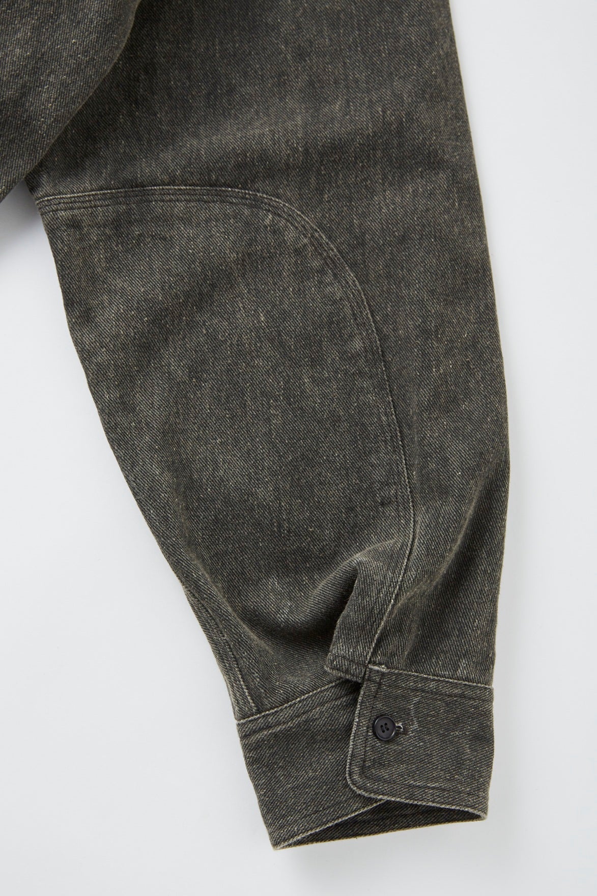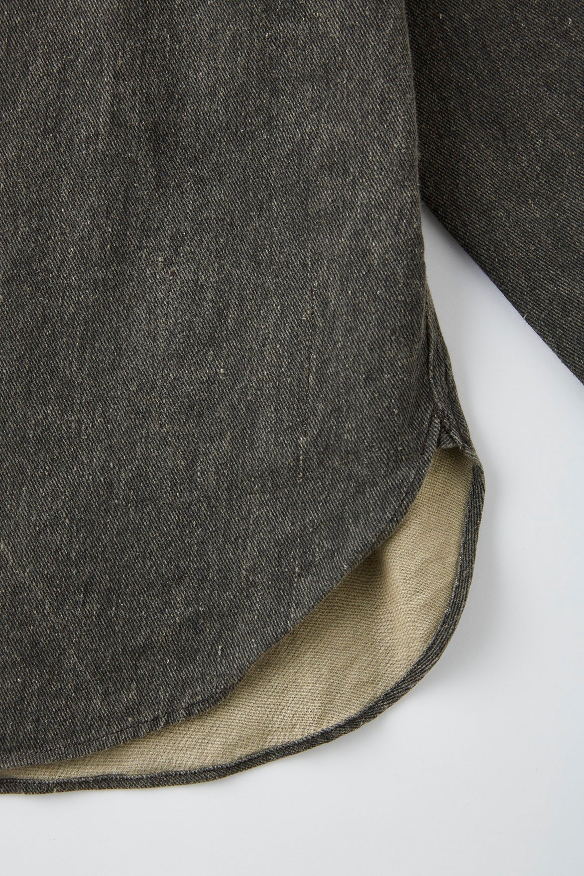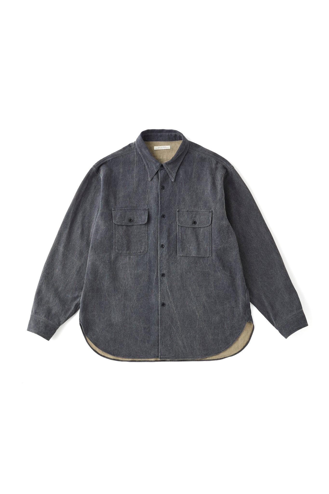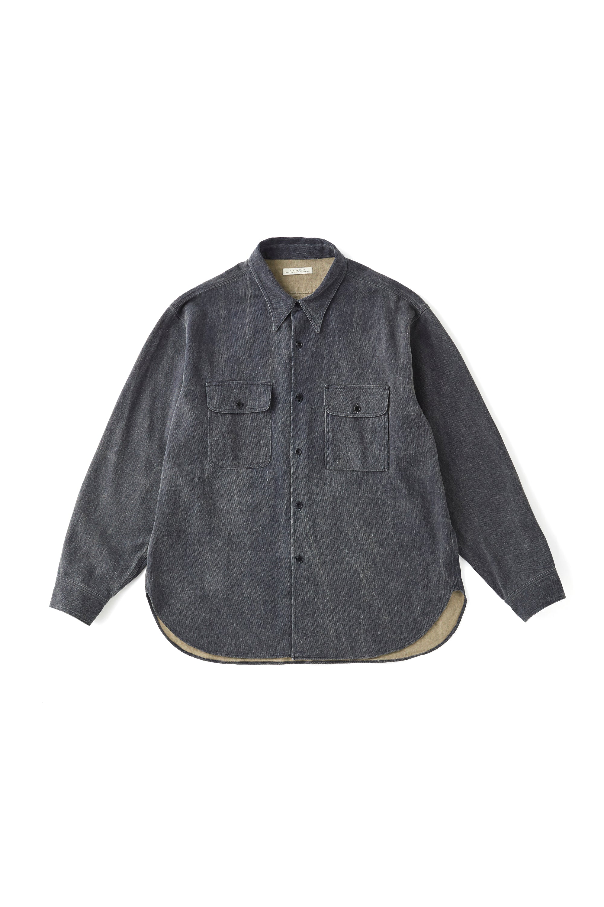 ミッドセンチュリー期のワーカーユニフォームからのインスピレーション。質実剛健なワークシャツをベースにアップデートさせたOLDJOEらしいシャツ。当時を彷彿させるロングポイントな襟先、肌に触れにくい仕様になったユニークなシガレットポケット、剣ボロのない簡素ながらも実用性に富んだ袖口の仕様、トリプルステッチやエルボーパッチなど目を引くディテールは敢えてそのままにデザインとして残している。また今季は敢えてジョルジュジャケット、ローバートラウザーとのセットアップと組めるようにラインナップ。国籍を跨いだ組み合わせが私たちらしいスリーピース。ベージュで地染めした生地に片面顔料コーティングを施したカツラギ。特殊なワッシャー機にてゆっくり揉み込みワッシャーを行い、エイジングした様なビンテージ感のある風合いに仕上げた。