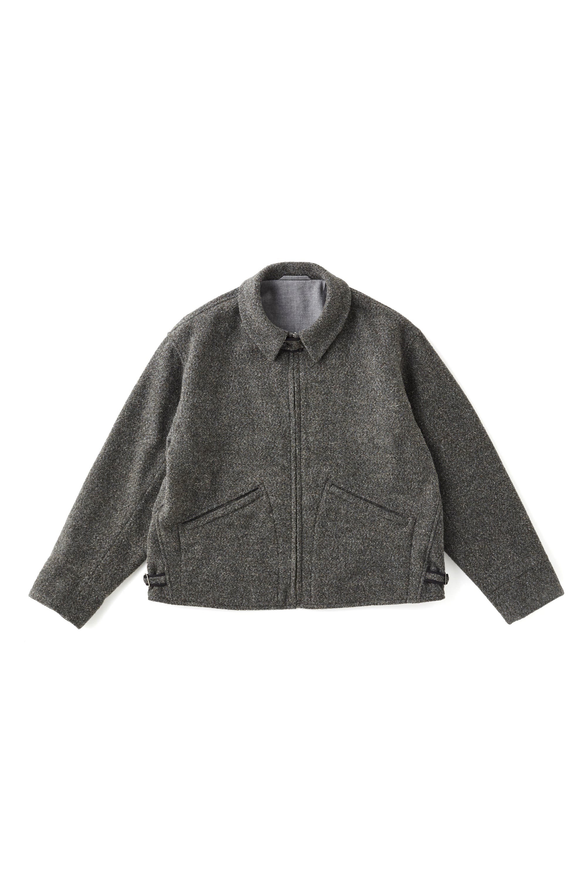 シンプルなジップフロントのショートジャケットはワークウェアの黎明期と言われる1930年代への敬意を評したピースとなります。前見頃に配したポケットと弧を描くスレキステッチ、静かに装備される首元のボタンループ、袋縫いで設計された襟など古き良きディテールとモダンな空気感が共存しています。多色使いで織り上げたケンピモッサからは他にはない色味の深さ、独特なタッチ感を感じれるでしょう。紡績時に不必要になった落ち毛(ケンピ)を混ぜ、原糸を緯糸に織り込み作成。表情は使い込んだヴィンテージ感とモッサー仕上げによるウォーム感が特徴。